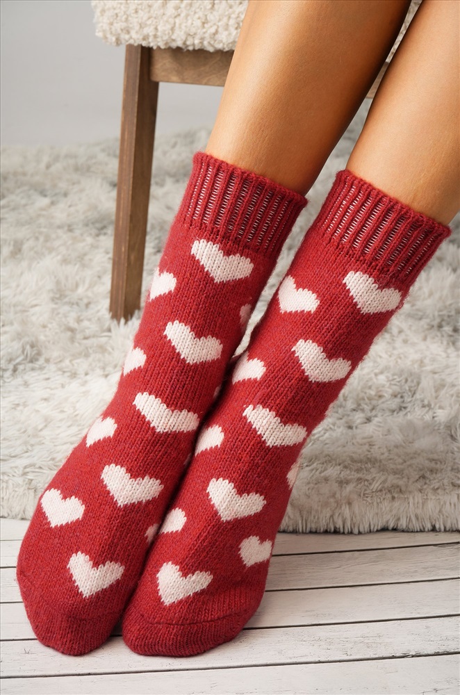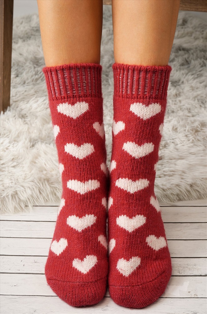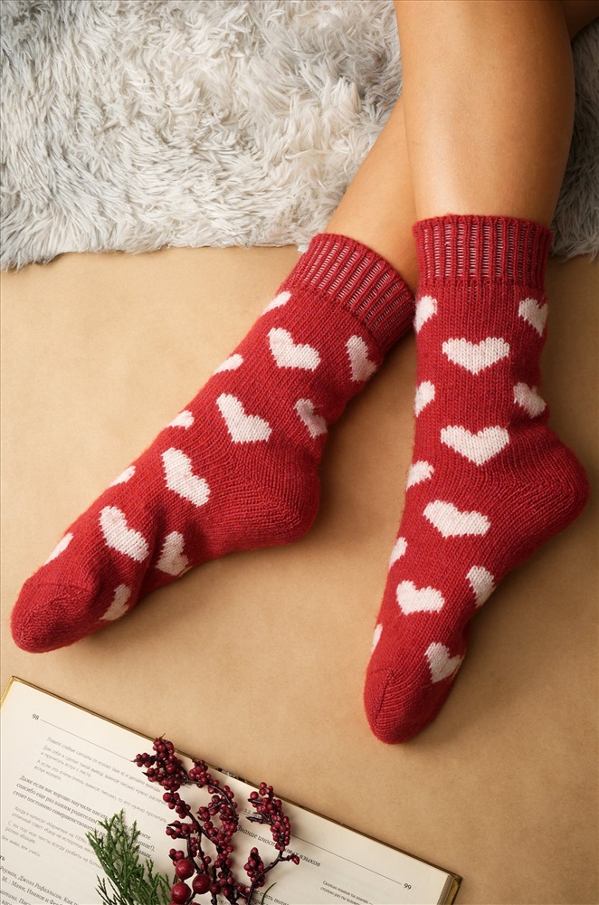 Теплые носки с сердечками создадут праздничное настроение на Новый год и Рождество. Вязаные шерстяные носочки подойдут для женщин, которые хотят чувствовать себя уютно дома у камина или на прогулке в снежный день.