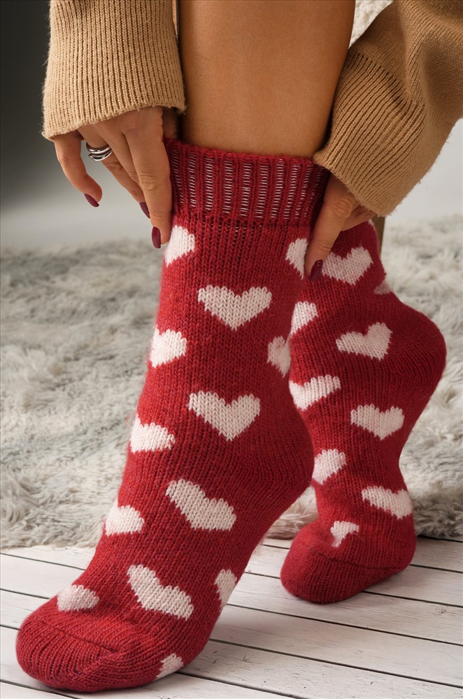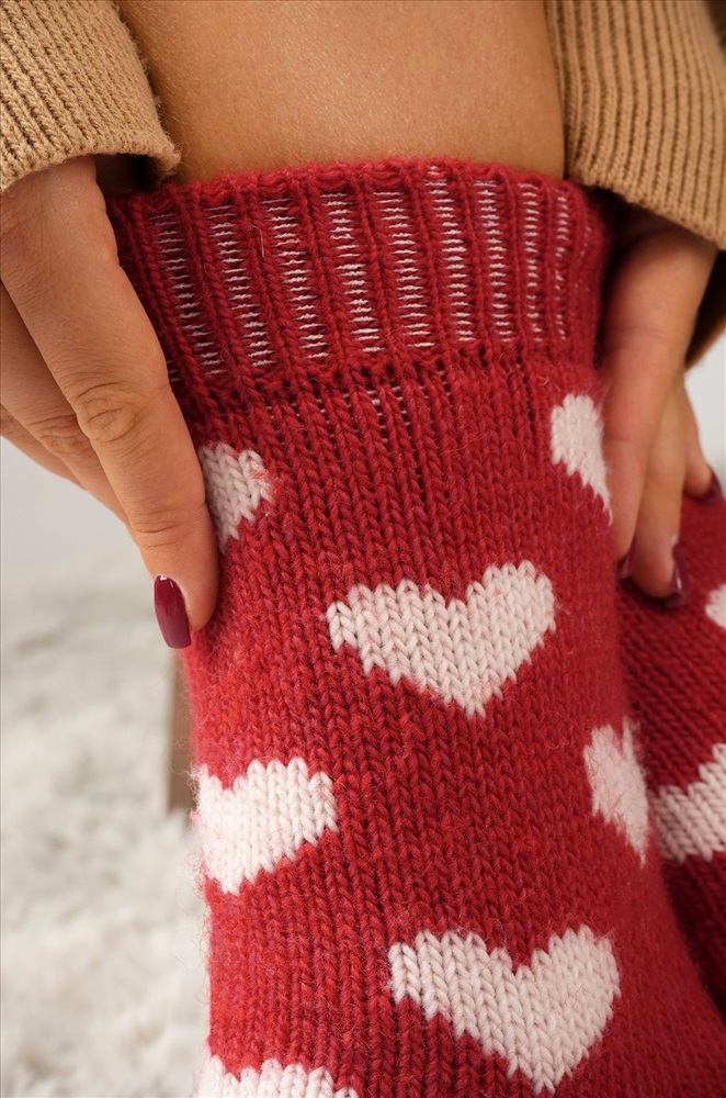 Уютные носочки для зимы! Красные шерстяные носки с рисунком Сердечки подарят тепло и нежность в холодные дни. Высокие женские носки связаны из мягкой шерсти и отлично держат тепло.