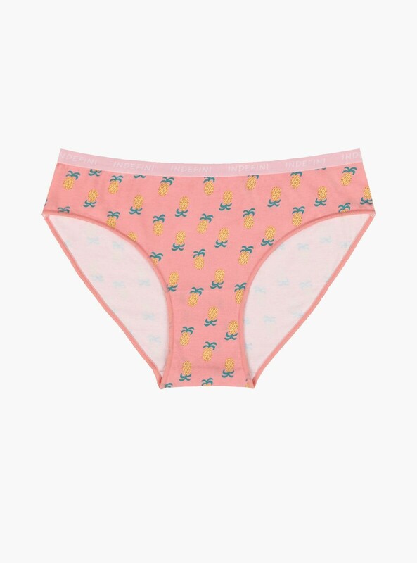 Выполнены в розовом цвете. Трусы средней посадки держатся на талии мягкой резинкой, украшенной надписью «INDEFINI». На внутренней стороне трусов имеется хлопковая ластовица. На трусы нанесён принт с изображением ананасов. 95% Хлопок 5% Эластан Комментарии к товару