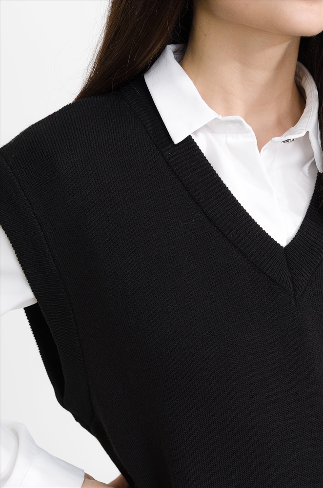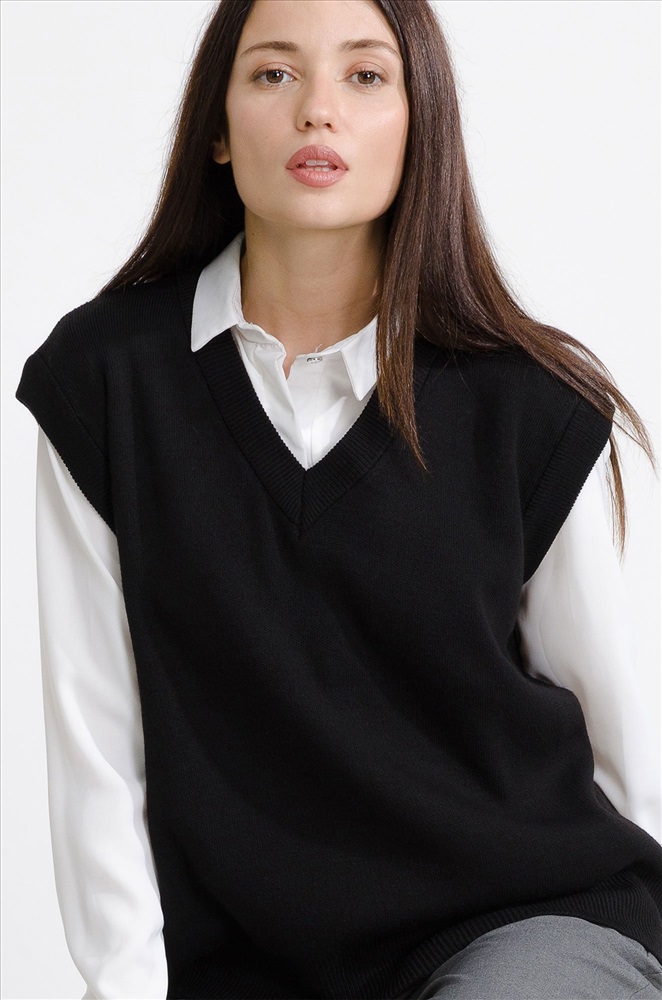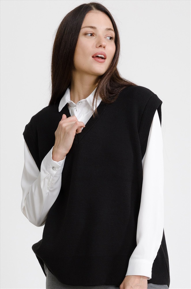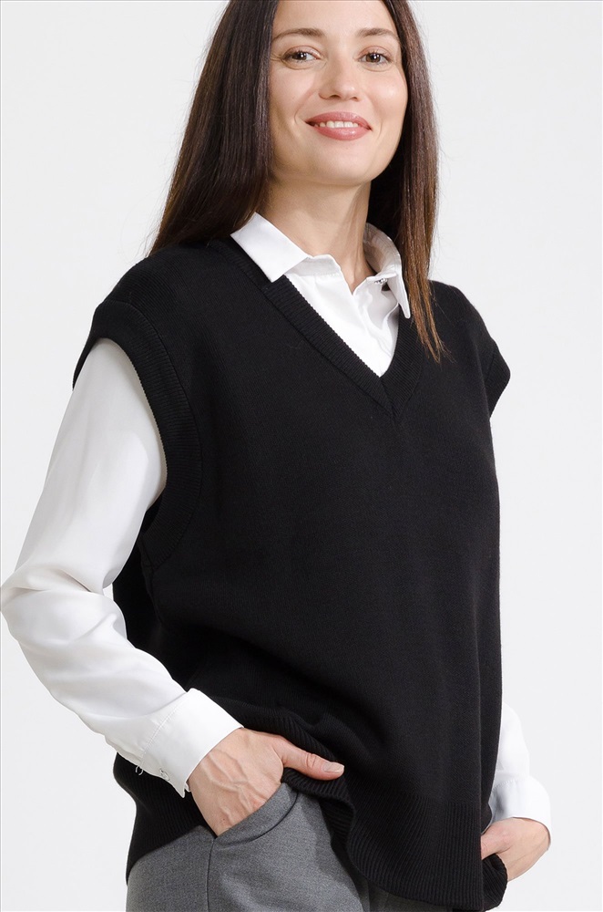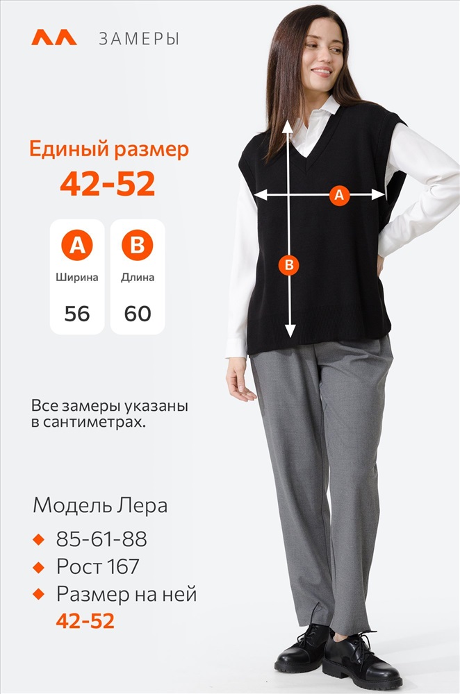 Женский вязаный жилет оверсайз – стильный и уютный элемент базового гардероба, который не только дополнит образ, но и согреет в холодную погоду. Вязаная жилетка one size подходит девушкам с любым типом фигуры, V-образный вырез подчеркнет зону декольте. Мягкая, приятная к телу смесовая пряжа из хлопка и шерсти прекрасно согревает в прохладное время года, а благодаря акрилу в составе жилет не растягивается и сохраняет форму долгое время. Утепленный жилет для девушек и женщин идеально подходит для демисезонного периода, весны и осени, а также для летних прохладных вечеров, когда хочется надеть что-то легкое и теплое. Однотонный жилет черного цвета отлично впишется в любой дресс-код, подойдет для деловой офисной встречи, в школу, а также в праздничной обстановке непременно украсит ваш элегантный лук. Благодаря универсальному размеру безрукавка подойдет девочкам подросткам, с ней получатся классные школьные образы. Модель Лера, ее рост 167 см, параметры 85-61-88 см. На ней черный жилет единого размера 42-52.