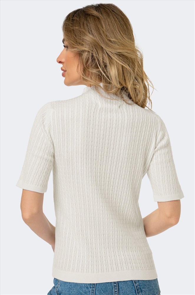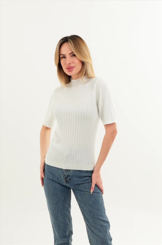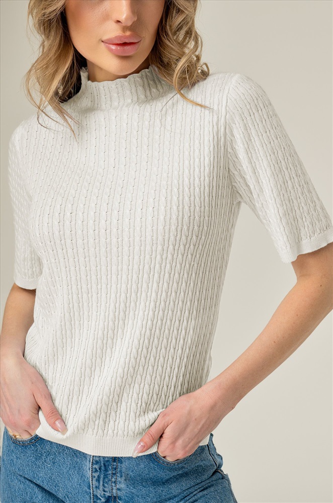Футболка с удлиненным рукавом выполнена из вязаного трикотажа. Воротник-стойка дополнен волнистыми краями – специально для изысканных натур! Белый джемпер выполнен из приятного к телу состава вискозы и акрила. Мягкие линии вязки и прямой крой делают этот белый джемпер незаменимым. Станьте центром внимания и превратите летние дни в модный показ! Однотонный джемпер для женщин будет уместен как для офиса, так и для образов в стиле smart casual (смарт кэжуал). Его можно носить как в заправленном виде, так и навыпуск. Вязаная футболка станет отличным решением на лето, теплую весну и осень. Летний джемпер пригодится на весеннее и осеннее время, он создан для стильных образов на каждый день. Сочетайте этот джемпер с классическим низом, и вы будете самой очаровательной! Модель Ирина, ее рост 167 см, параметры 85-61-89. На ней джемпер размера 40-44.
