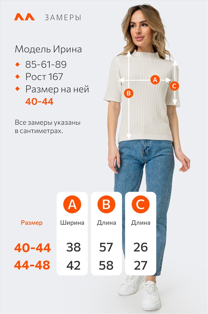 Размер 40-44: длина: 57 см; ширина: 38 см; длина рукава внешняя: 26 см; длина рукава внутренняя: 12 см.
