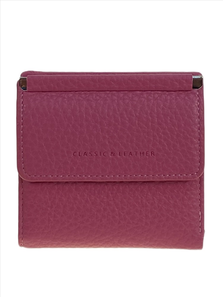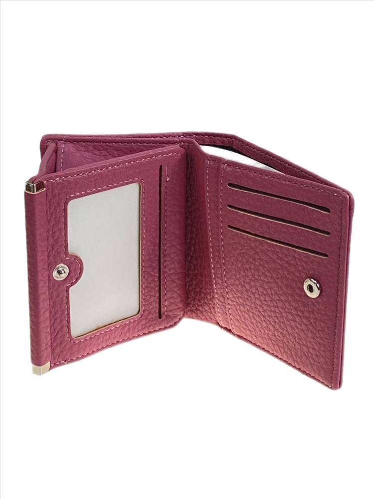 Компактный женский кошелёк из натуральной кожи. Закрывается на магнитную кнопку, внутри отделение под купюры, на развороте: 3 отсека для пластиковых карт, 2 открытых отделения, 1 отделение с пластиковым окном. Снаружи отделение для мелочи на магнитной кнопке.