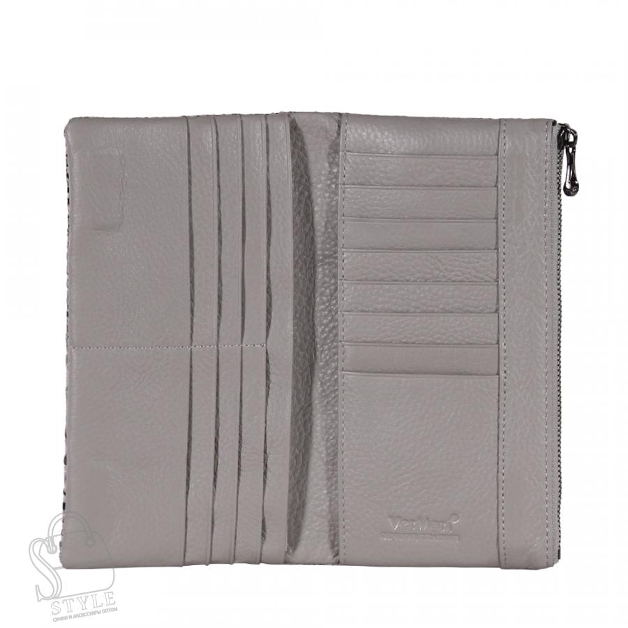 Кошелек раскладывается пополам, внутри два открытых кармана, шестнадцать карманов для визиток и пластиковых карт. Фурнитура темное серебро.