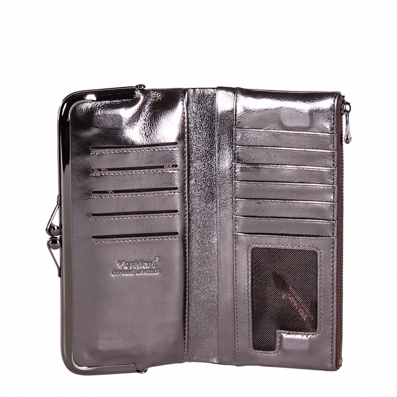 Высота (см): 10 Бренд: Vermari Материал: Натуральная кожа Полноразмерный кошелек складывается пополам, выполнен из натуральной кожи. Дополнен фурнитурой темное серебро. Закрывается на магнитные кнопки. Внутри: двенадцать отделов для карт, два отдела открытых Снаружи: один карман закрывается на молнию, один на фермуар. Комментарии к товару