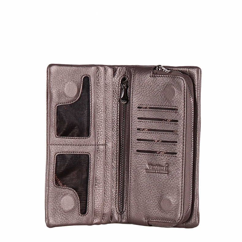 Высота (см): 10 Бренд: Vermari Материал: Натуральная кожа Полноразмерный кошелек складывается пополам, выполнен из натуральной кожи. Дополнен серебристой фурнитурой. Закрывается на магнитные кнопки. Внутри: два кармана на молниях. Девять отделов для карт, один карман открытый. Снаружи: основной отдел на кнопках. Два кармана на молниях. Комментарии к товару