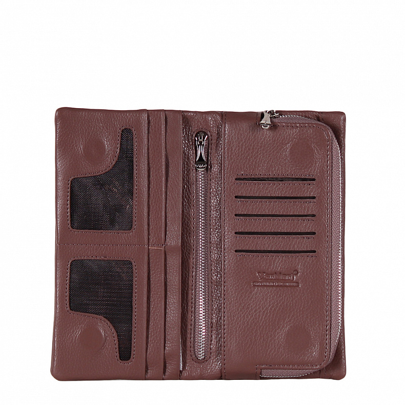 Внутри: два кармана на молниях. Девять отделов для карт, один карман открытый.