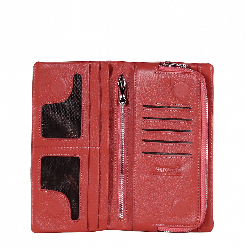 Внутри: два кармана на молниях. Девять отделов для карт, один карман открытый.