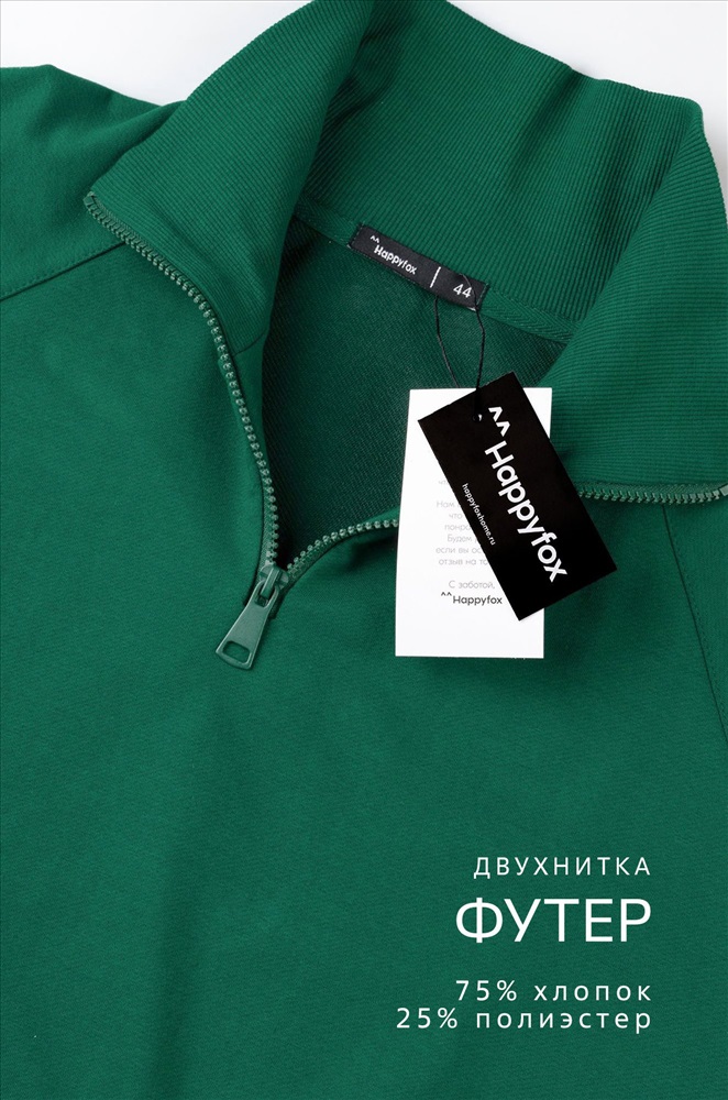 Бренд: Happyfox Страна: Узбекистан Состав: 75% хлопок, 25% полиэстер Материал: Футер двухнитка Плотность ткани: 230 г/м2 Цвет: зеленый