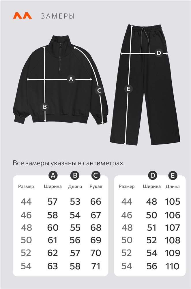 Размер 48: толстовка: длина:55 см; ширина:60 см; длина рукава внешняя:68 см; длина рукава внутренняя:41 см.
