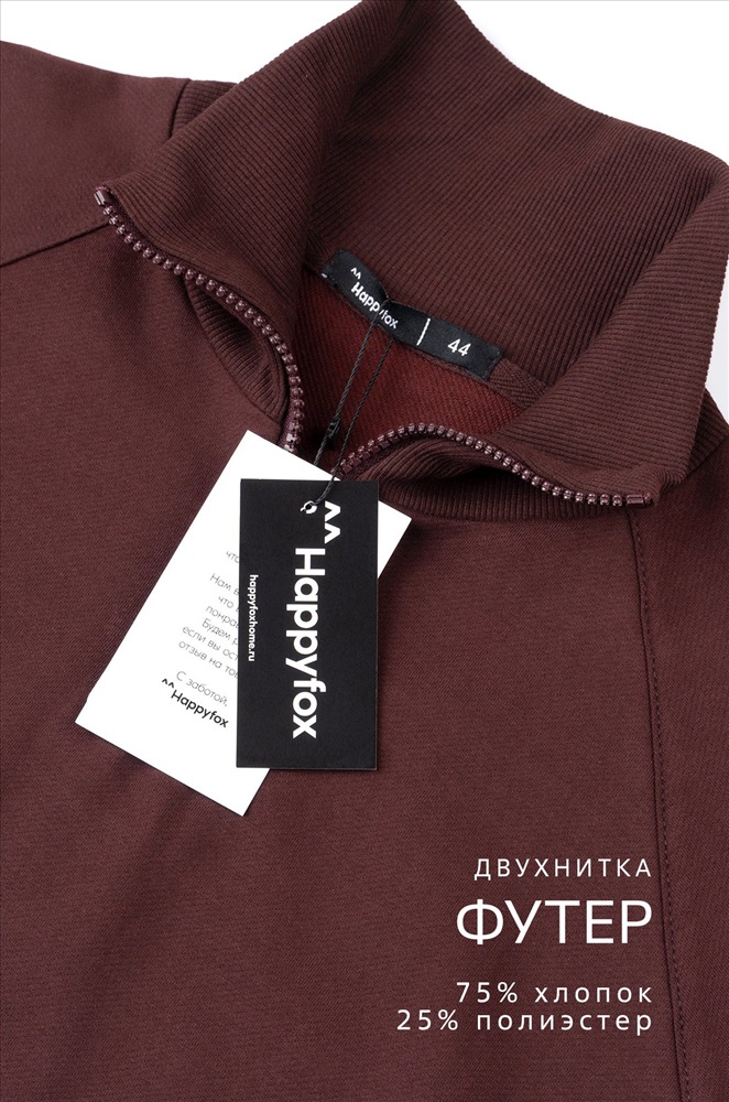 Бренд: Happyfox Страна: Узбекистан Состав: 75% хлопок, 25% полиэстер Материал: Футер двухнитка Плотность ткани: 230 г/м2 Цвет: шоколадный