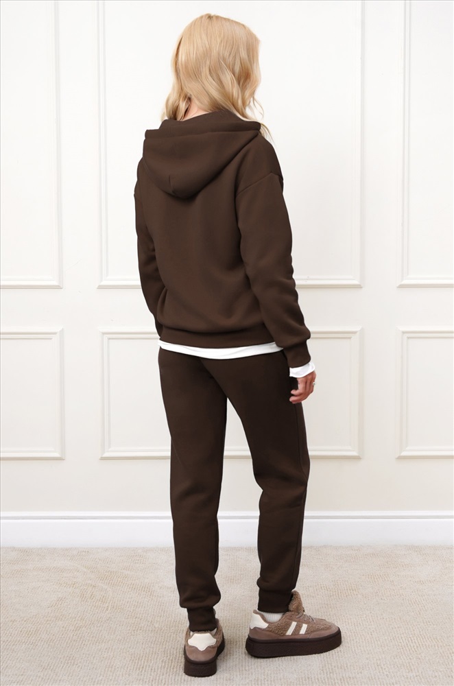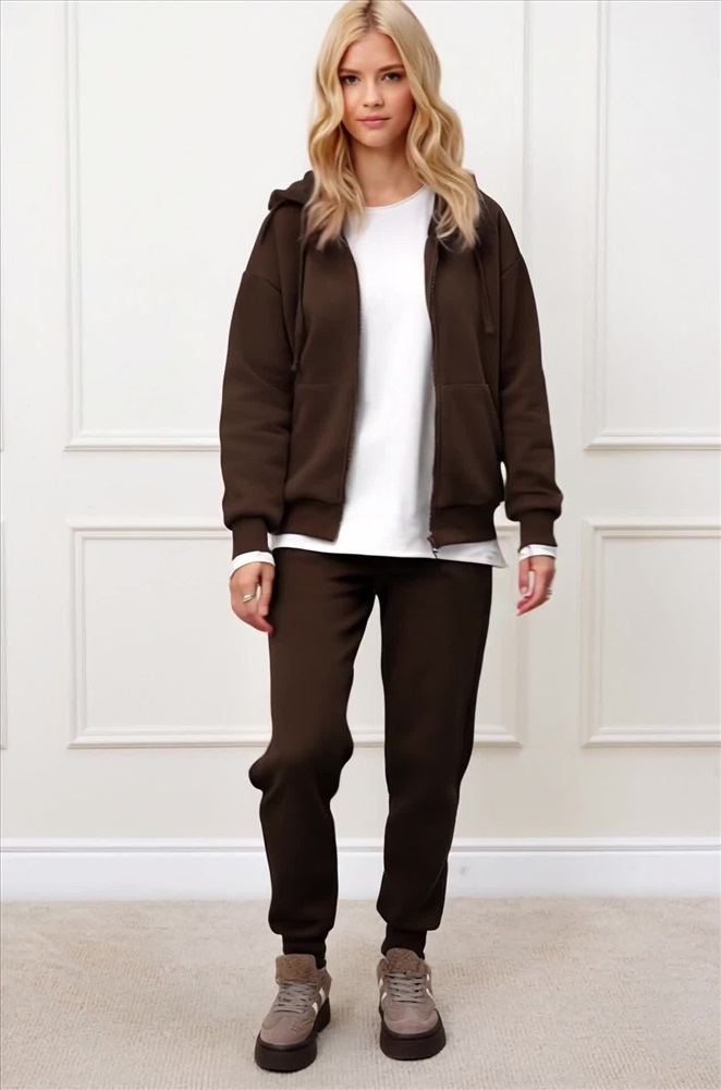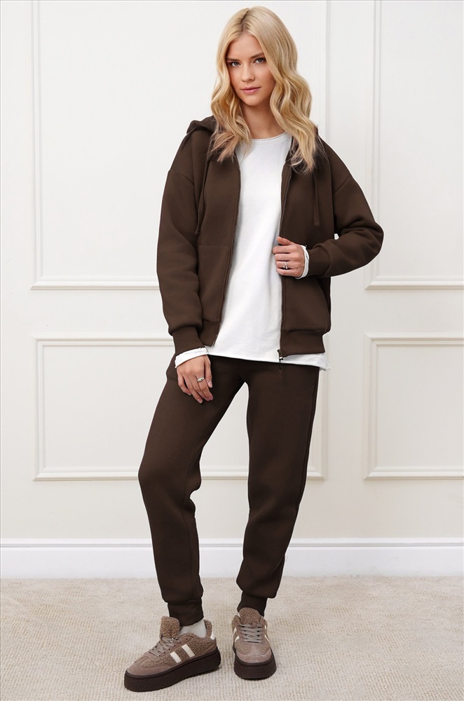 Женский теплый костюм с начесом — стильное и практичное решение для холодного времени года. В набор входят худи на молнии с капюшоном и удобные брюки-джоггеры.