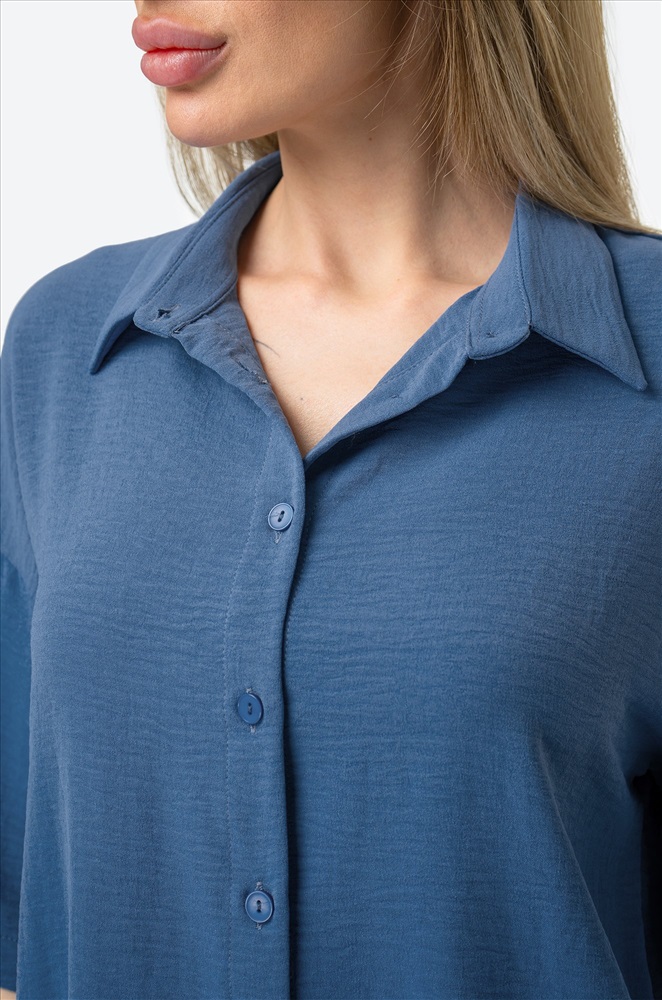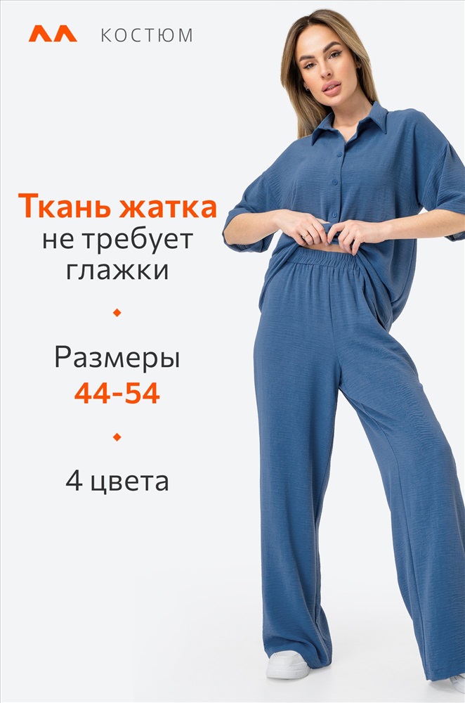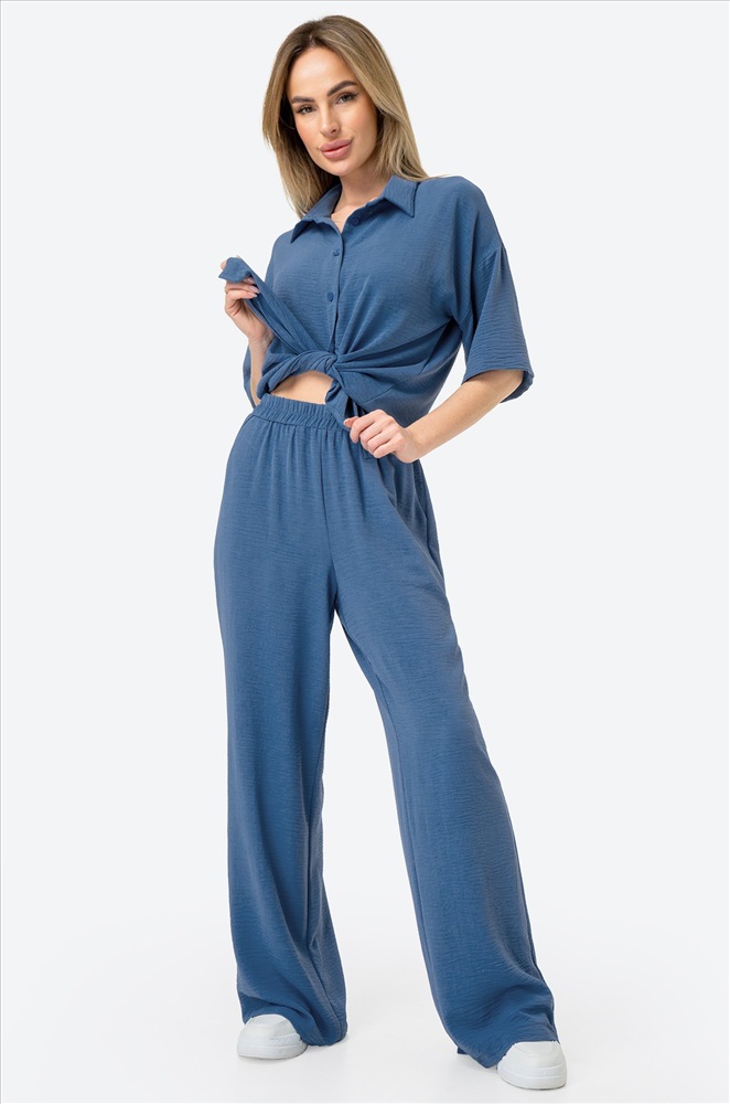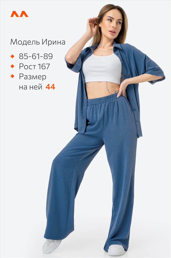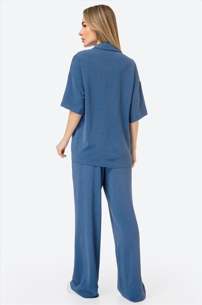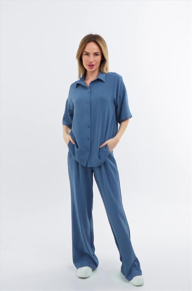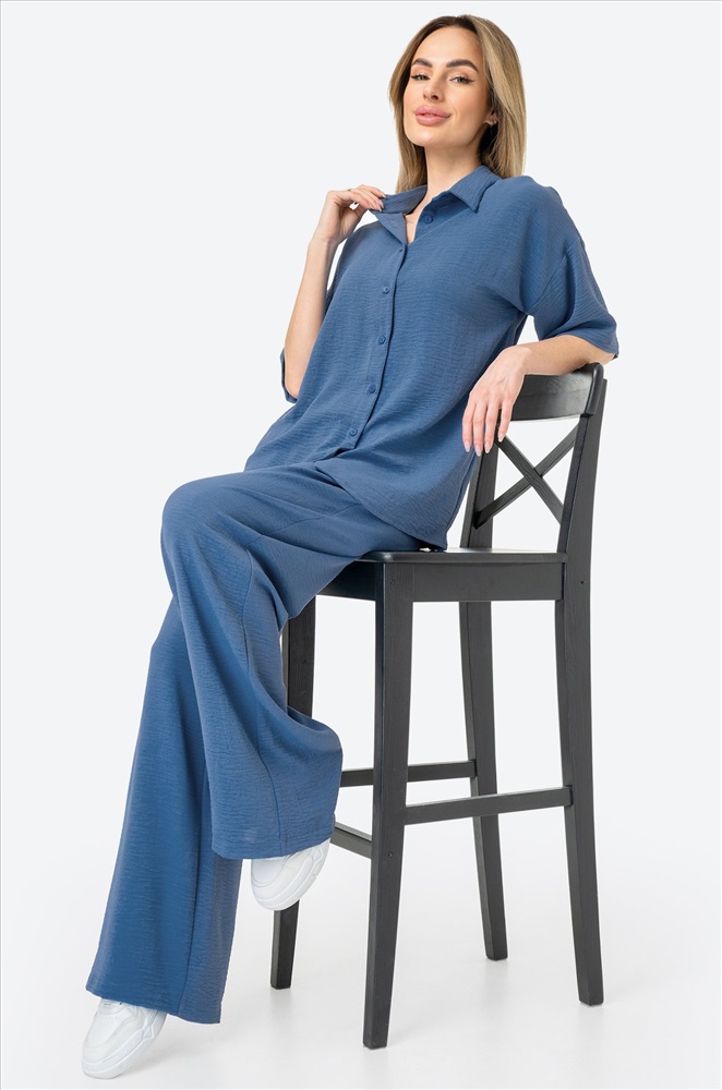 Легкий женский костюм с брюками и рубашкой оверсайз — простое и красивое решение на лето. Модель выполнена из фактурной ткани жатка, которая не мнётся и создает мягкий и свободный силуэт. Брючный костюм синего цвета сочетает комфорт и элегантность, позволяя чувствовать себя уверенно в любой ситуации.