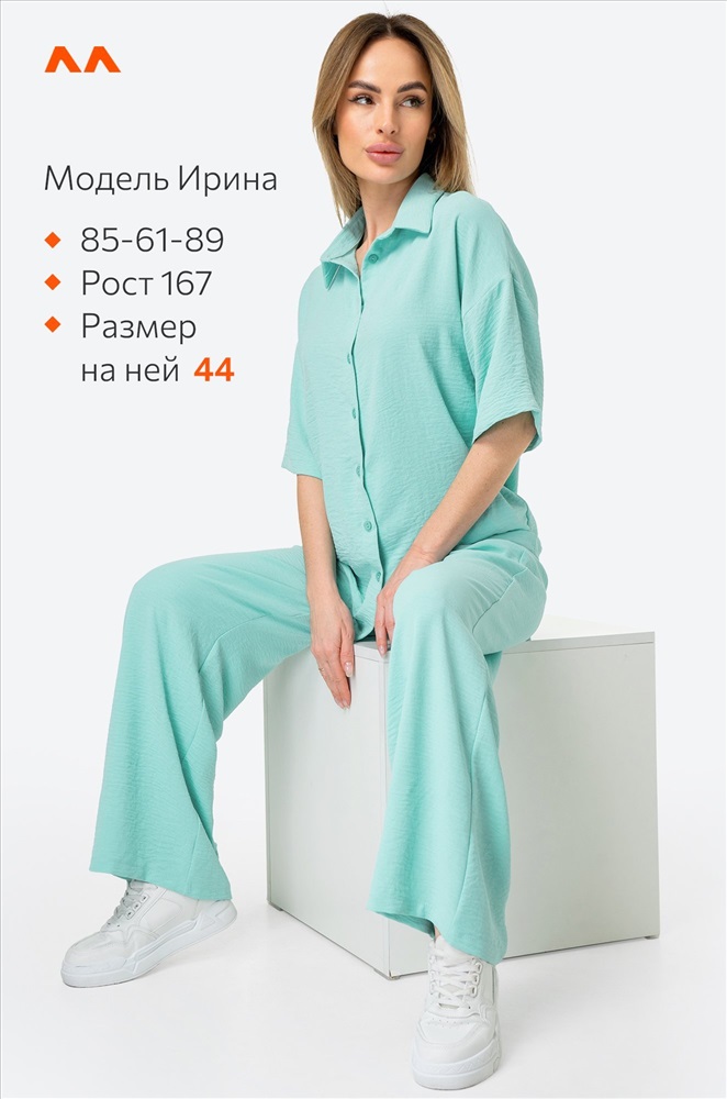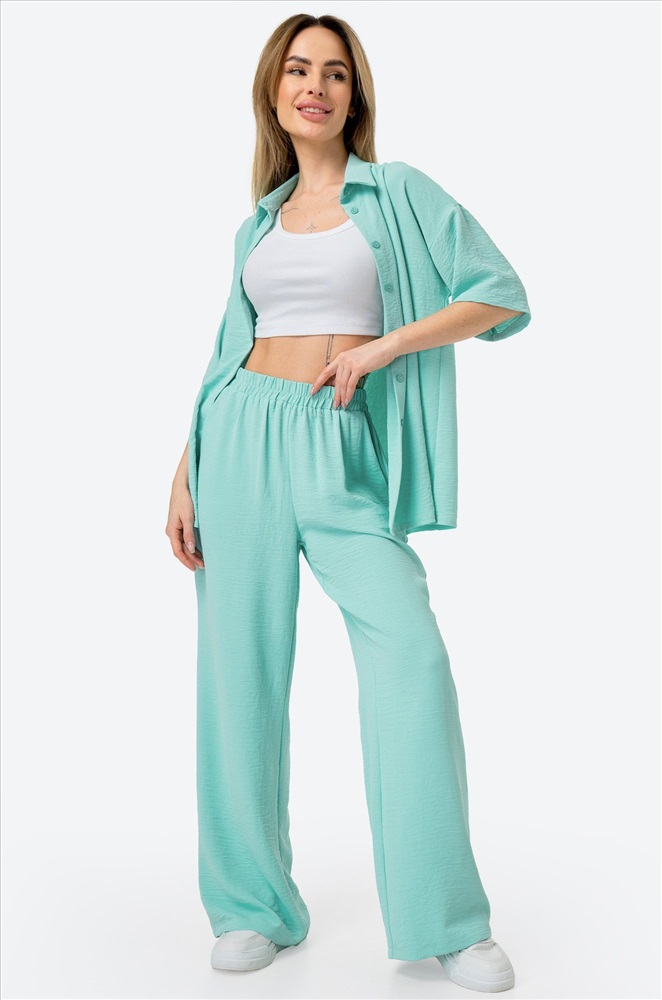 Легкий женский костюм с брюками и рубашкой оверсайз — простое и красивое решение на лето. Модель выполнена из фактурной ткани жатка, которая не мнётся и создает мягкий и свободный силуэт. Брючный костюм ментолового цвета сочетает комфорт и элегантность, позволяя чувствовать себя уверенно в любой ситуации.