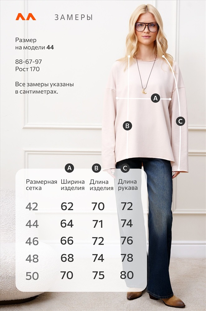 Размер 44: длина:71 см; ширина:64 см; длина рукава внешняя:74 см; длина рукава внутренняя:46 см.