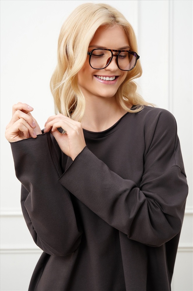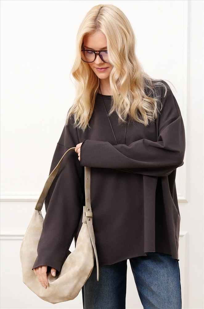 — спущенное плечо и круглый вырез добавляют расслабленности;