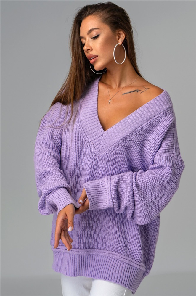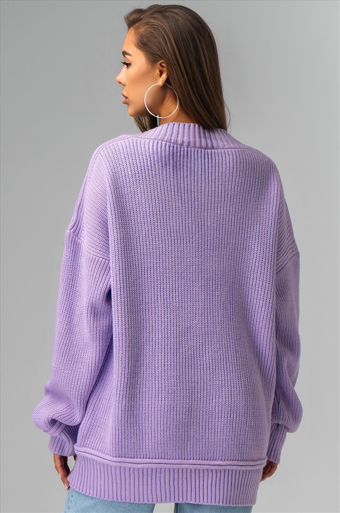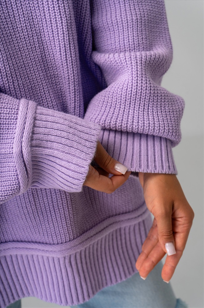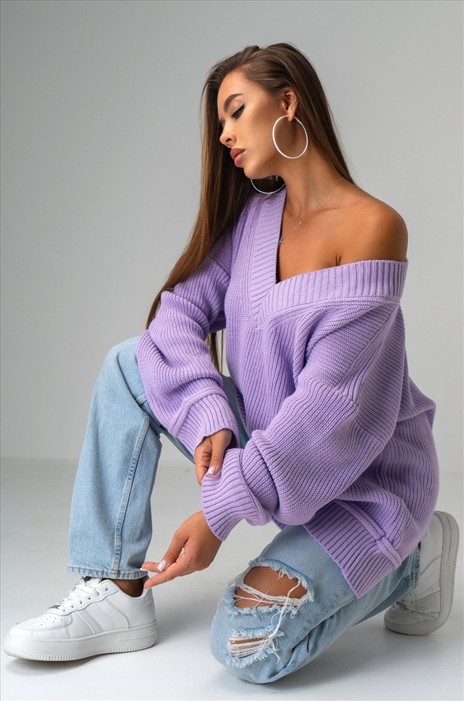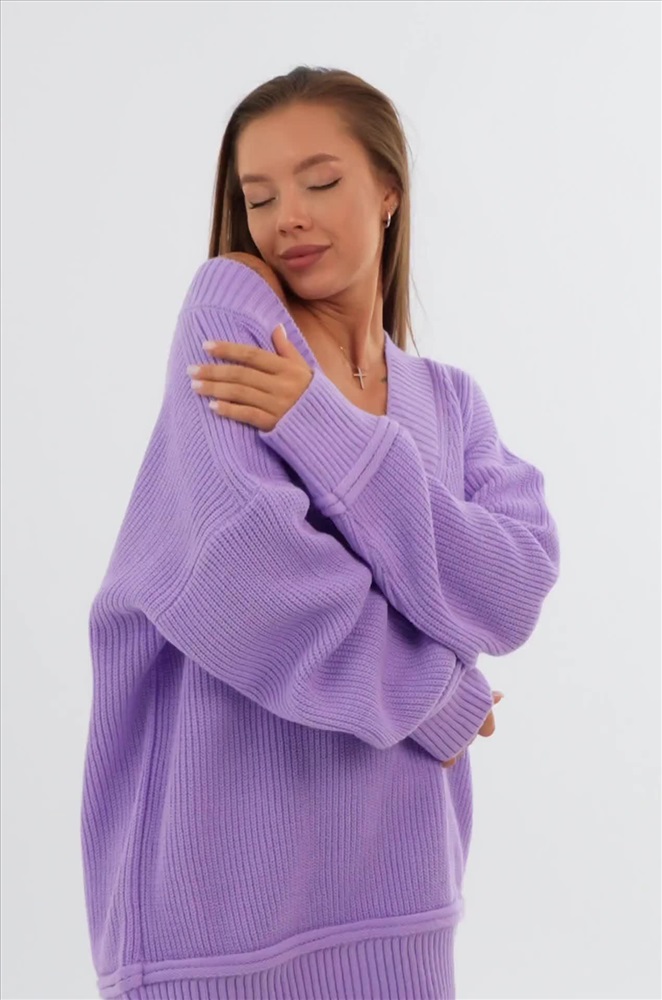 Женский джемпер в сиреневом цвете станет идеальным выбором для создания классного образа. Оверсайз фасон и V-образный вырез добавят легкости и элегантности, а длинный рукав гарантирует комфорт в прохладную погоду. Выполненный из вязаного трикотажа однотонный свитер отличается мягкостью и теплотой. Такой материал прекрасно держит тепло, при этом оставаясь дышащим и приятным к телу. Вязаный джемпер имеет свободный крой и спущенное плечо, что придает ему модный и расслабленный вид. Низ пуловера и рукава украшены декоративными элементами. Демисезонная модель — универсальный элемент гардероба. Удлиненный вязаный свитер будет идеален для женщин, которые ценят комфорт и стиль. Универсальный размер 42-52 подходит для любого типа телосложения. Модель Анфиса, рост 170 см, параметры 88-67-97 см. На ней единый размер 42-52.