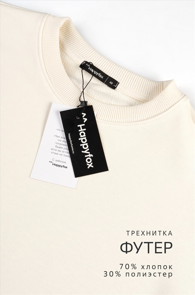 Бренд: Happyfox Страна: Узбекистан Состав: 70% хлопок, 30% полиэстер Материал: Футер трёхнитка Плотность ткани: 310 г/м2 Цвет: молочный