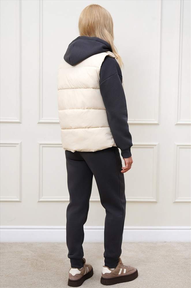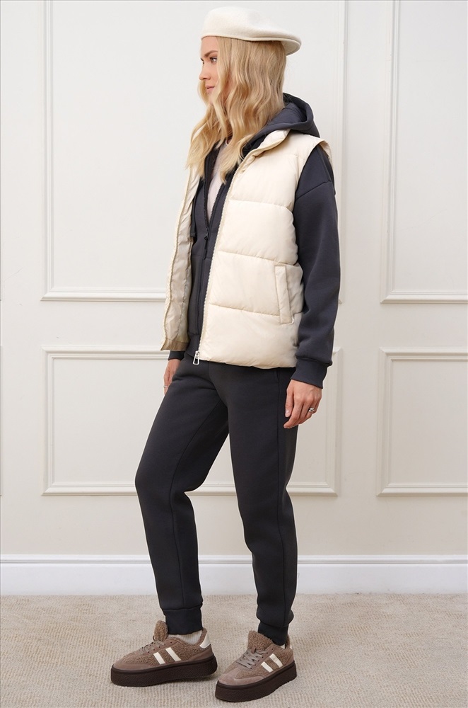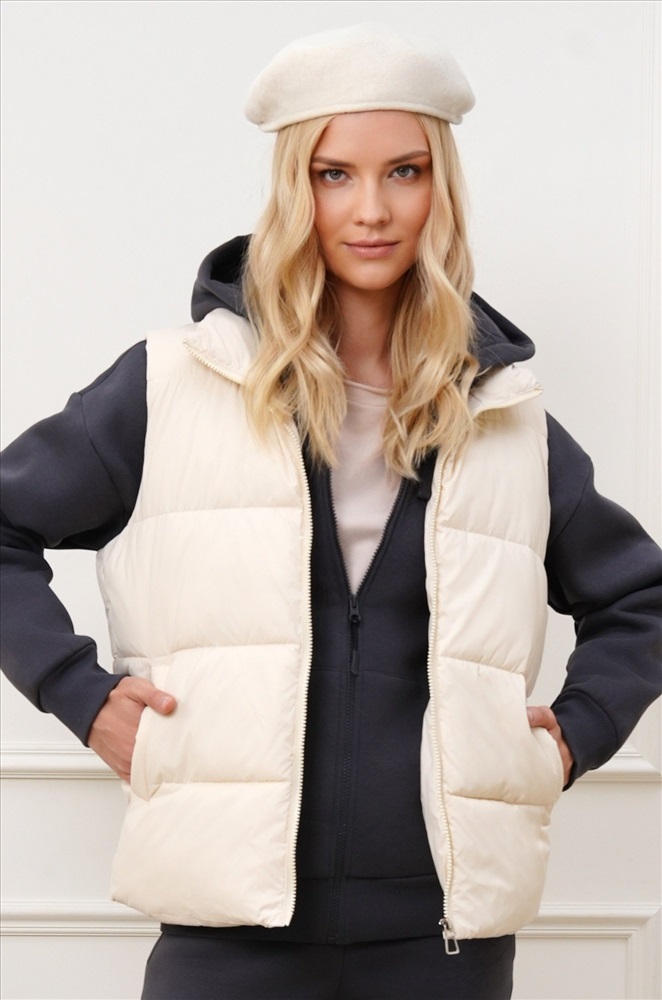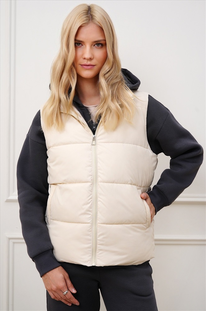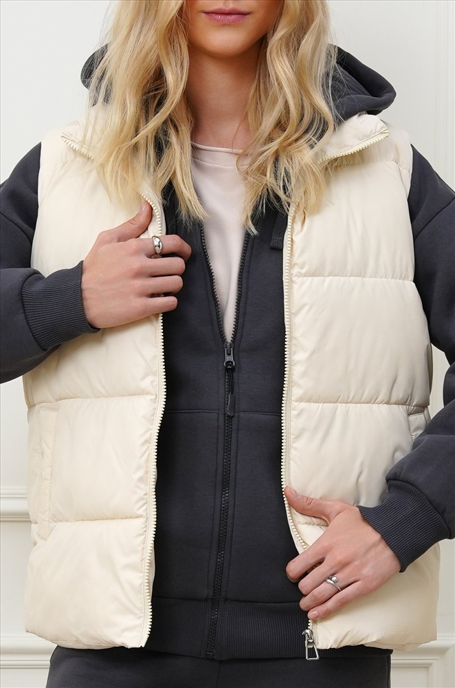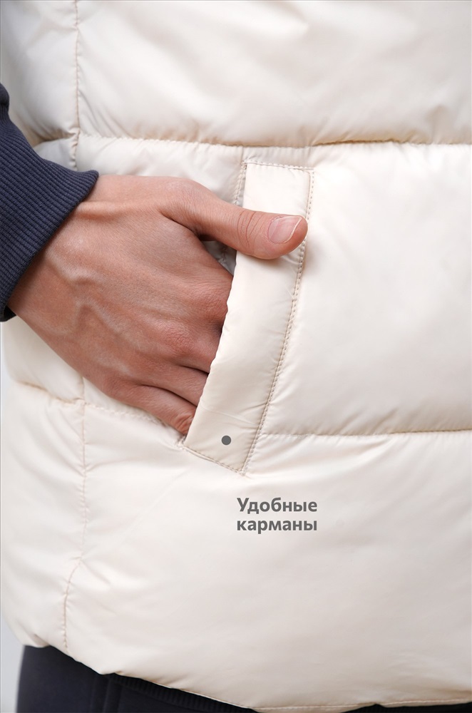 Преимущества: — утеплитель Down cotton (синтепон) с оптимальной плотностью 200 г/м²; — непродуваемая болоньевая ткань защищает от ветра; — удобные карманы; — широкая горизонтальная отстрочка визуально стройнит. Бежевая безрукавка для женщин и девушек станет универсальным выбором для осенних и весенних прогулок, путешествий и повседневных образов.