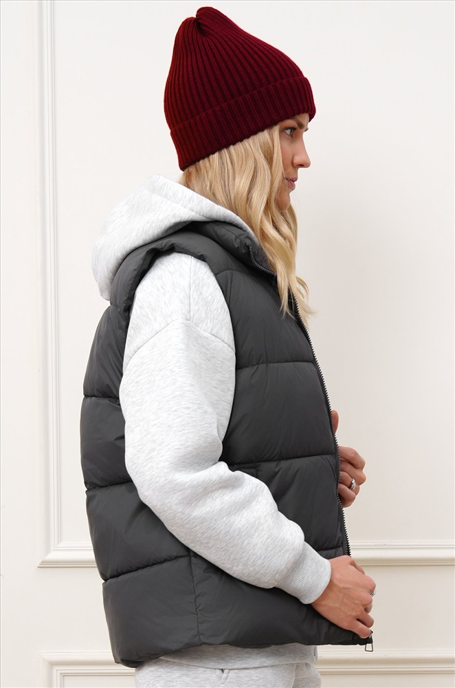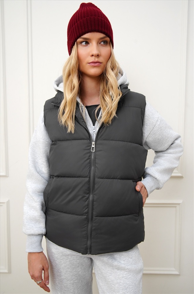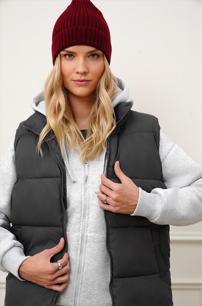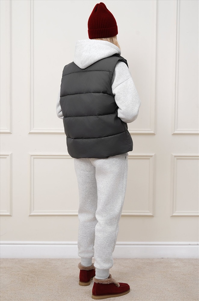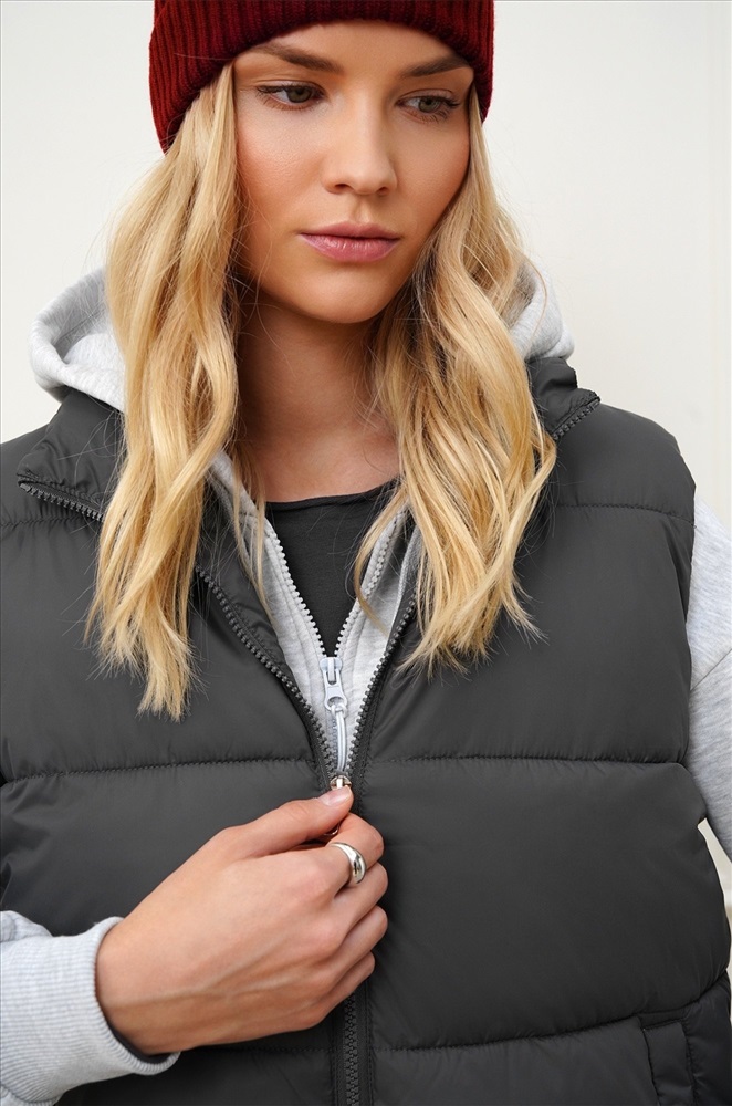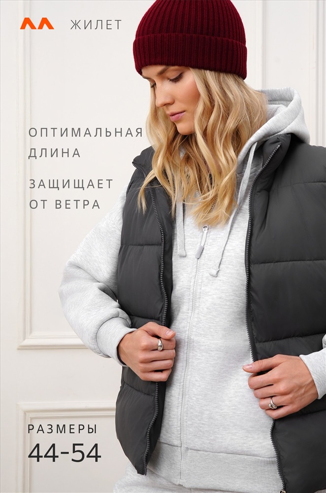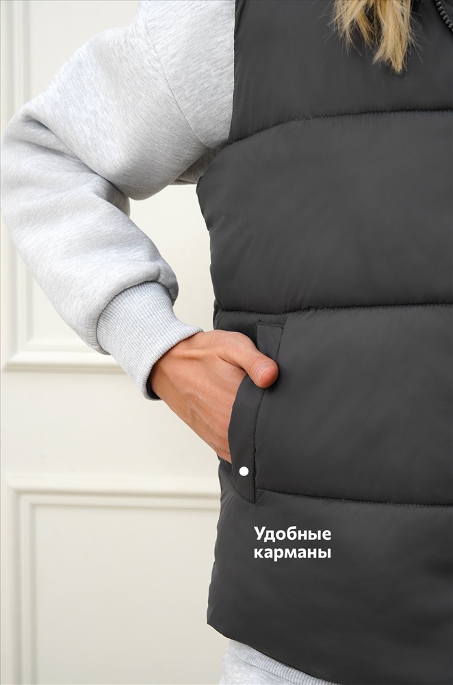 Преимущества: — утеплитель Down cotton (синтепон) с оптимальной плотностью 200 г/м²; — непродуваемая болоньевая ткань защищает от ветра; — удобные карманы; — широкая горизонтальная отстрочка визуально стройнит. Темно-серая безрукавка для женщин и девушек станет универсальным выбором для осенних и весенних прогулок, путешествий и повседневных образов.
