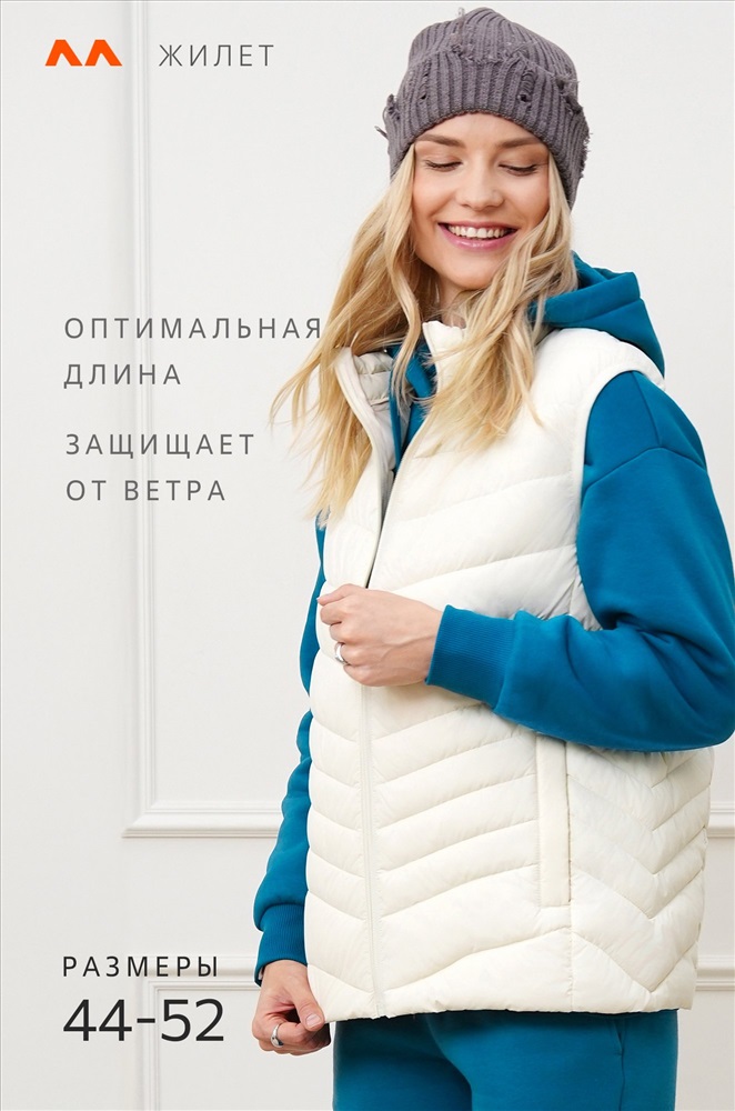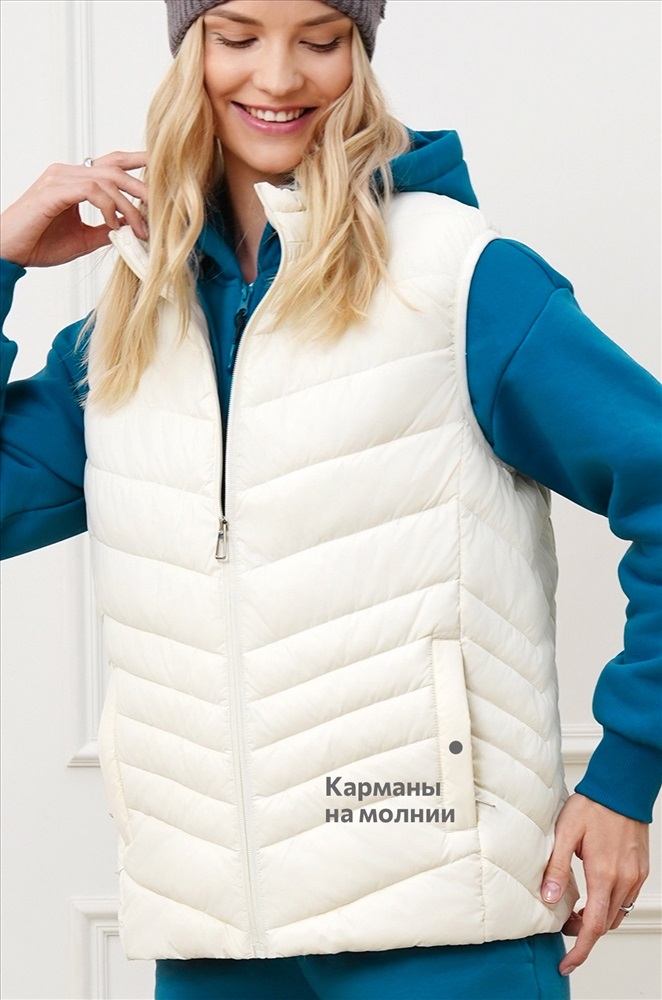 Преимущества: – инновационный утеплитель Down Cotton, синтепон (плотность 160 г/м2) – лёгкий, тёплый и держит форму; – ветрозащитная болоньевая ткань и водоотталкивающее покрытие; – продуманная функциональность – удобные карманы на молнии; – оригинальная диагональная отстрочка как стильный акцент. Теплая жилетка для женщин – это универсальный элемент демисезонного гардероба. Она идеальна для осенних и весенних прогулок, путешествий и повседневных образов.