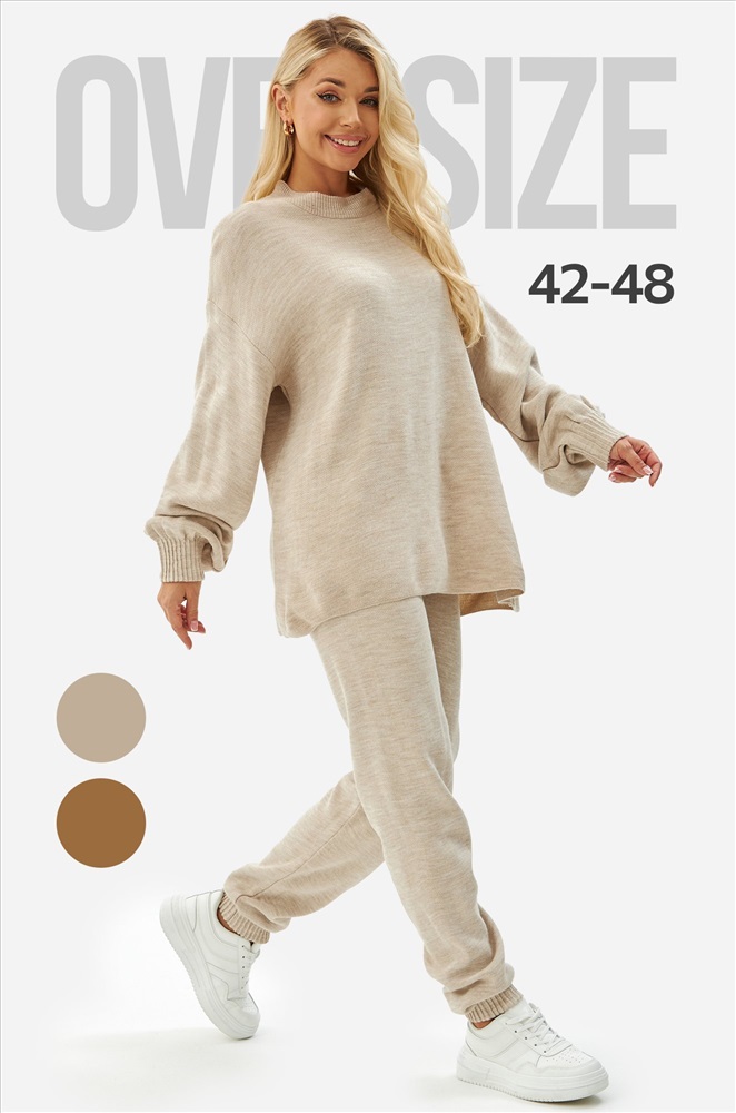 Женский костюм из вязаного трикотажа в бежевом цвете – идеальный выбор для стильных и уверенных в себе леди. В комплекте джемпер оверсайз и брюки джоггеры на резинке.