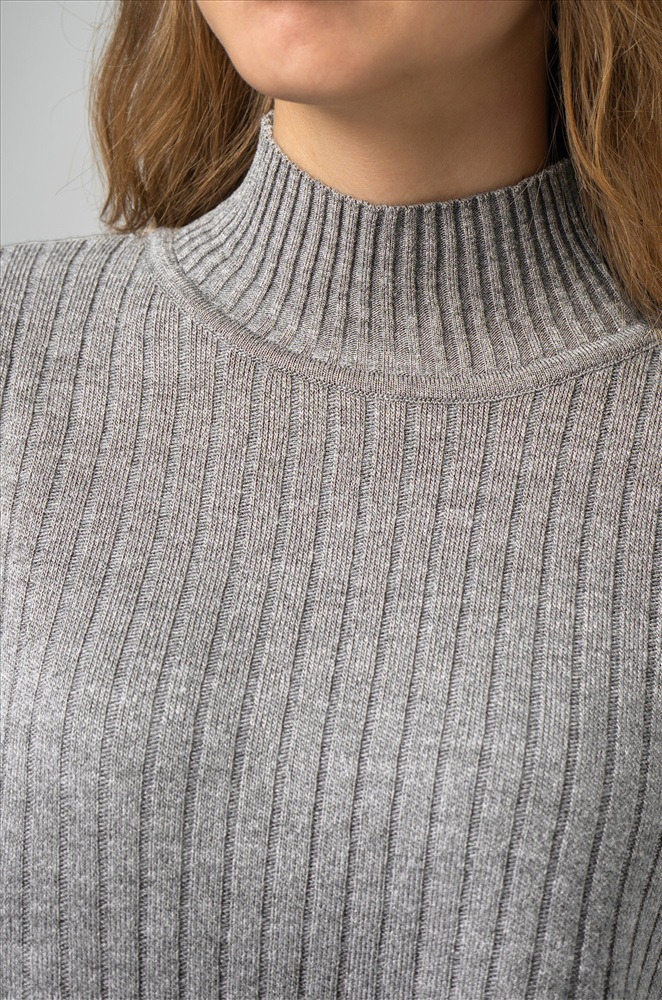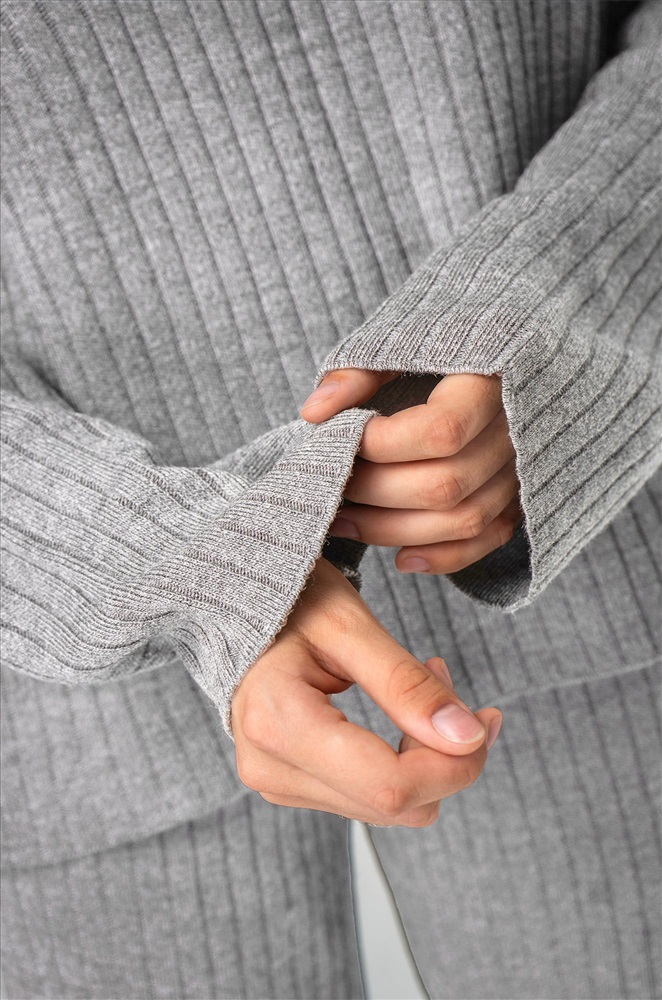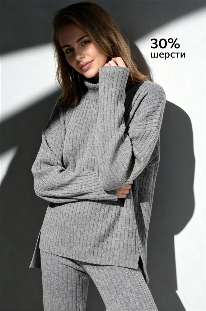 Крой оверсайз (oversize) поможет ощутить уют, а крупная фактурная вязка в рубчик станет стильным акцентом. Мягкий джемпер с воротником стойкой не только сохраняет тепло, но и добавляет образу элегантности. По бокам имеются эффектные разрезы. Брюки-клеш подчеркивают фигуру и создают женственный силуэт, оставаясь при этом невероятно удобными.