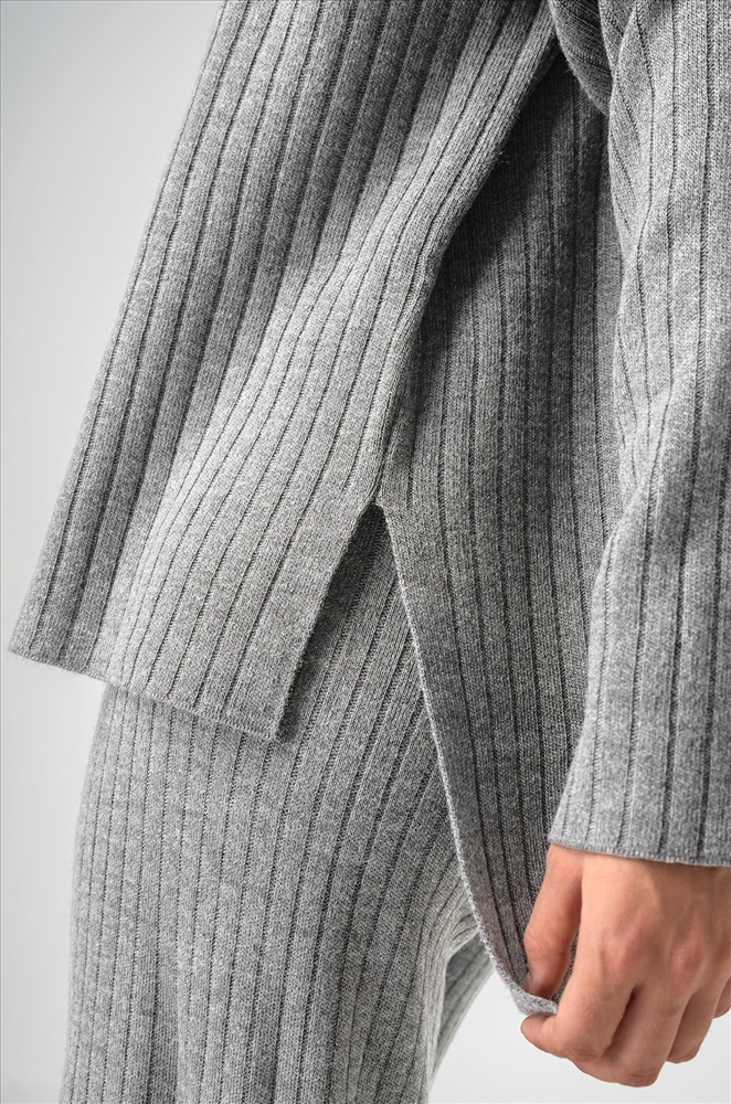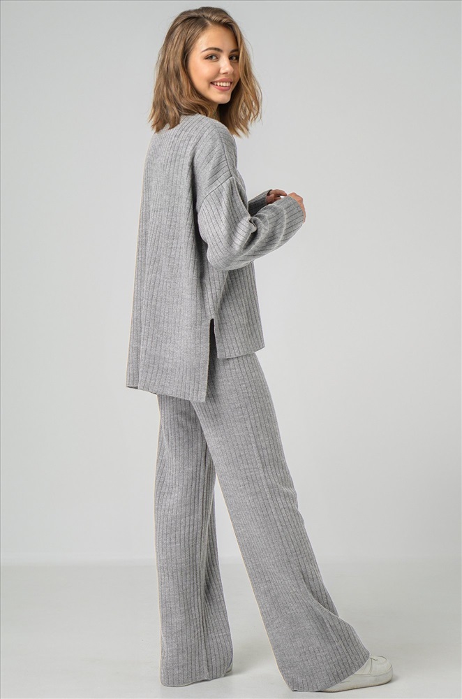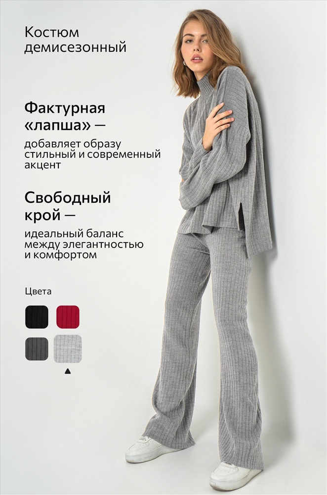 Женский серый костюм из вязаного трикотажа лапша — идеальный выбор для уверенных в себе леди.