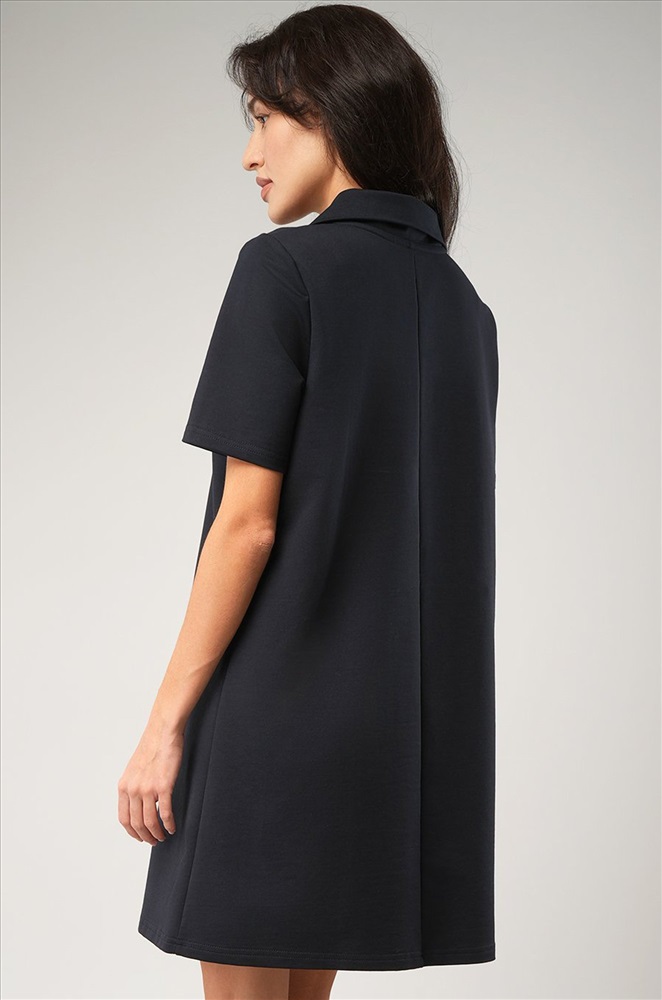 Преимущества: — однотонное платье поло выполнено из хлопкового трикотажа футер двухнитка (240 г/м2), который дышит и приятен к телу; — хлопковое платье хорошо сохраняет форму; — фасон мини подчеркивает женственность и придает образу легкость; — короткое платье-поло с отложным воротником смотрится стильно; — свободный силуэт не сковывает движений. Темно-синее платье — прекрасное решение для образов в спортивном стиле.