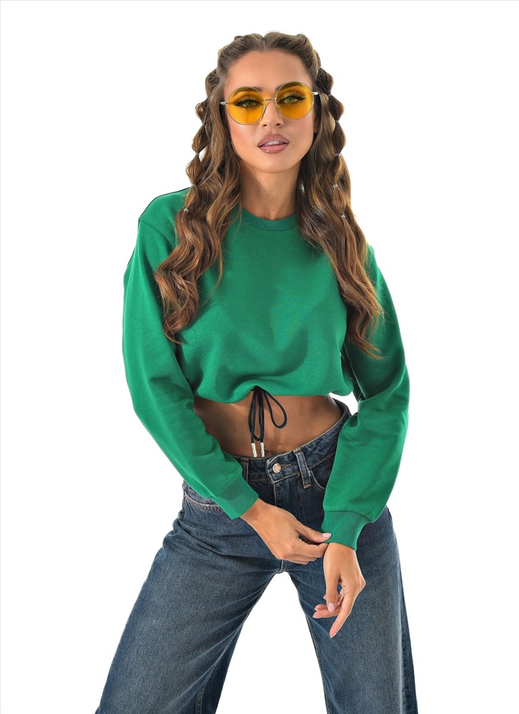 Свитшот имеет округлый ворот и модный укороченный крой. Объем можно регулировать с помощью шнуровки по низу, что делает его очень комфортным. На спине свитшот украшен фирменным принтом.