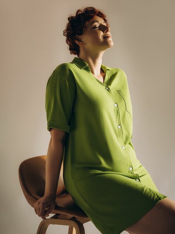 Выполнено в зеленом цвете. Платье с короткими рукавами и отложным воротником застёгивается на пуговицы и имеет нагрудный карман. Платье свободного прямого кроя. 85% Вискоза 12% Лён 3% Хлопок Комментарии к товару