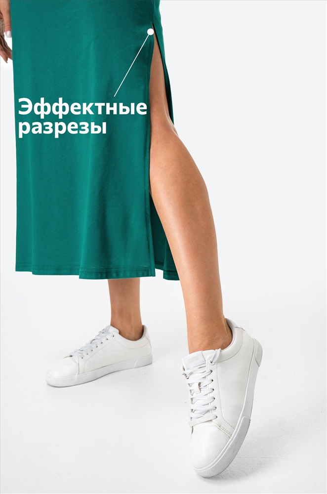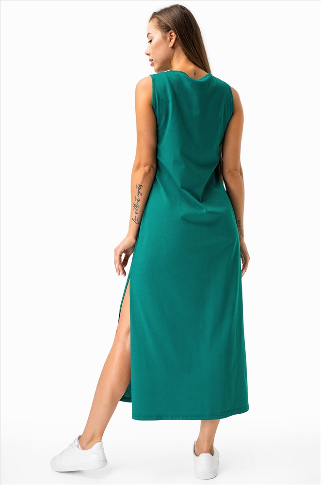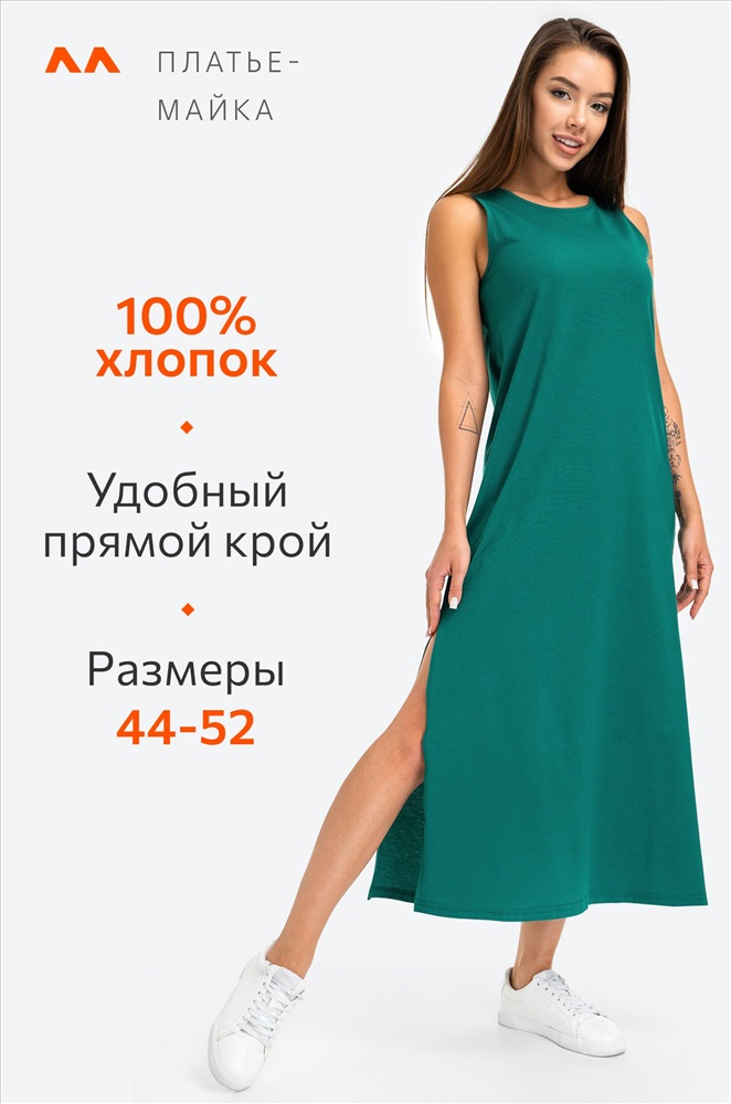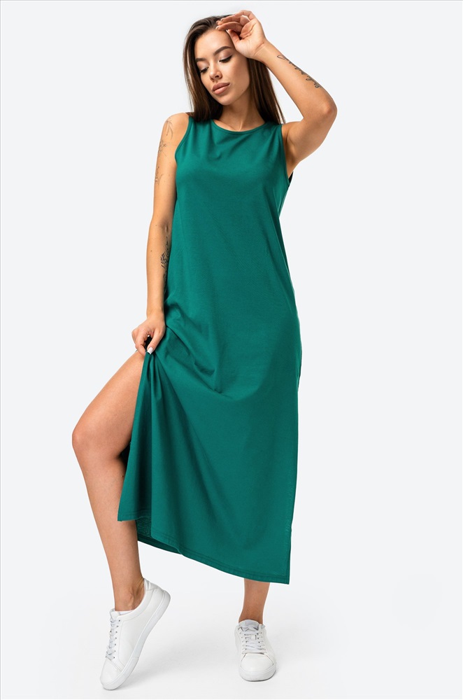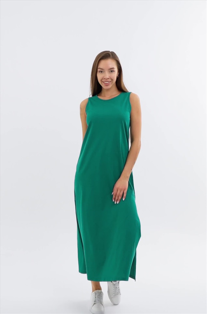 Повседневная модель с эффектными разрезами по бокам выполнена из натурального 100% хлопка – идеально для лета! Благодаря удобному А-силуэту и свободному крою платье визуально удлиняет силуэт. Длинное платье-майка представлено в изумрудном цвете.