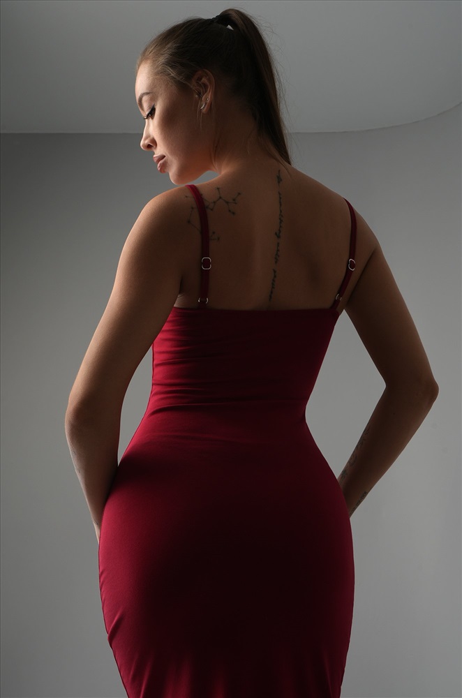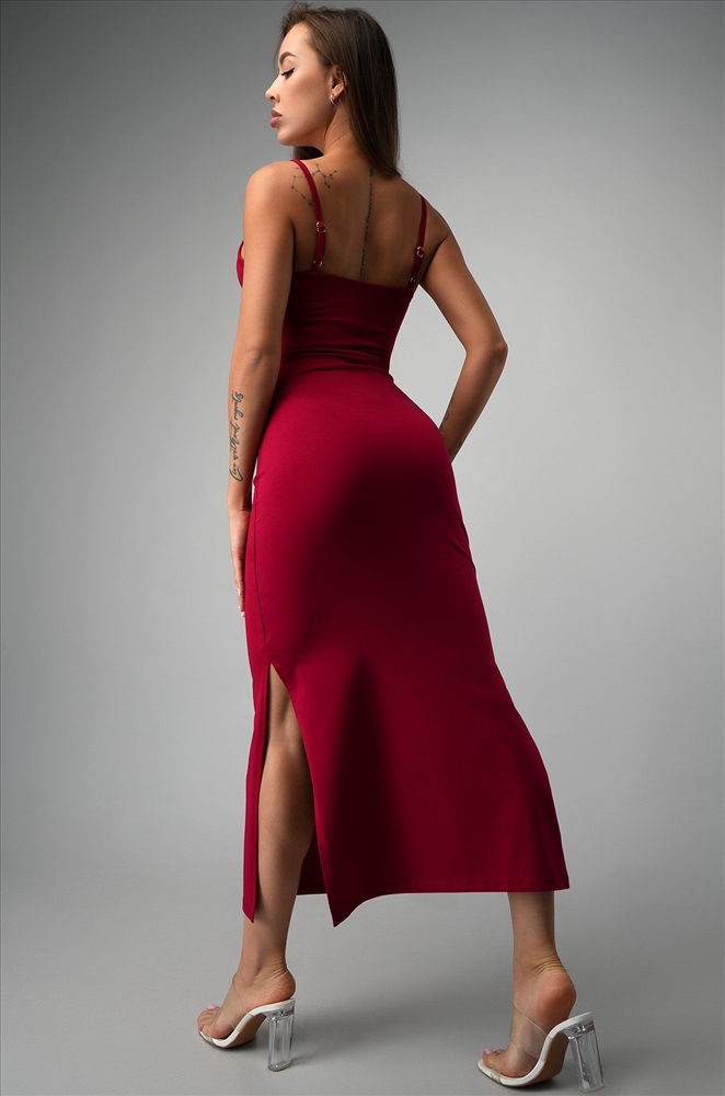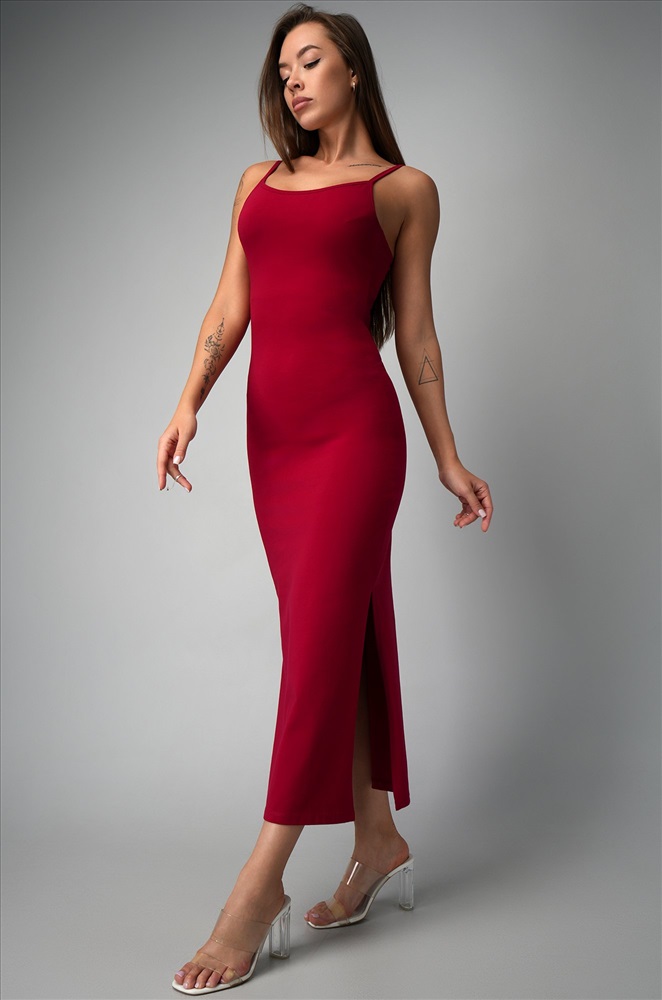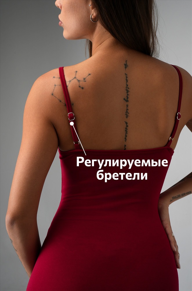 Трикотаж мягко облегает тело, ведь в составе — дышащий хлопок с добавлением лайкры. Кулирная гладь прекрасно тянется, эффектно подчёркивая изгибы. Благодаря двухслойной ткани на груди платье не просвечивает. Длина миди визуально вытягивает силуэт, а разрезы по бокам добавляют движения и лёгкой дерзости. Регулируемые бретели позволяют подстроить посадку под особенности фигуры. Однотонное платье оттенка бургунди станет основой классных образов. Летнее платье в обтяжку подойдёт для прогулок. Обтягивающее платье для женщин идеально для свиданий. Модель Анфиса, ее рост 170, параметры: 88-67-97. На ней размер 44.