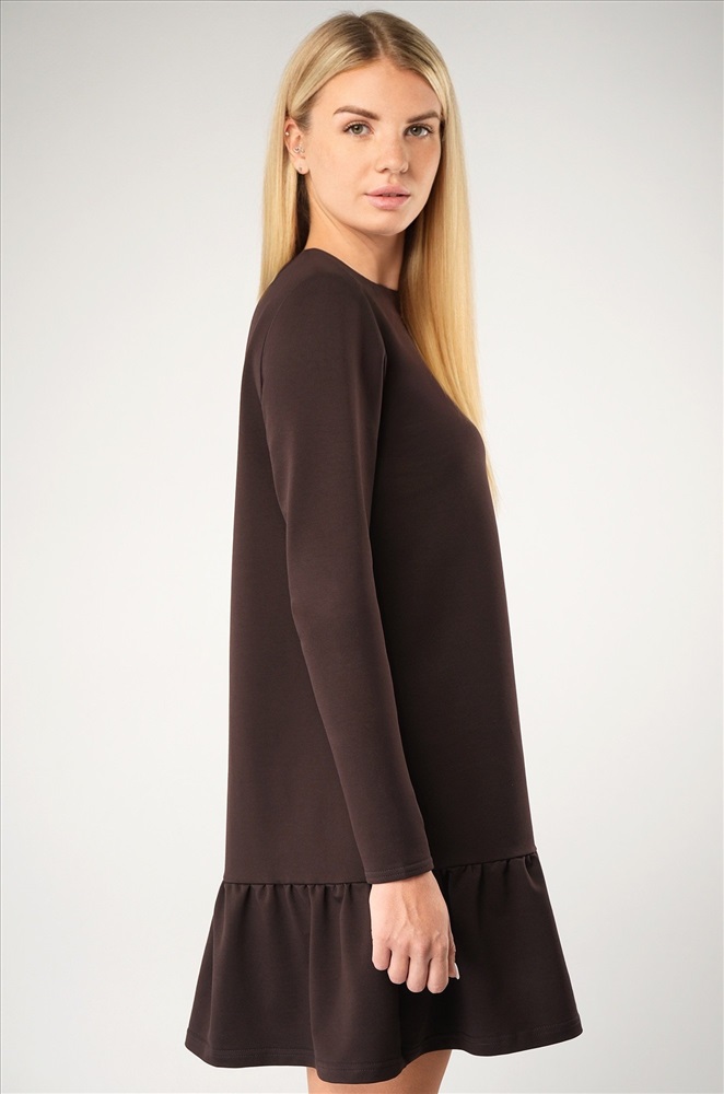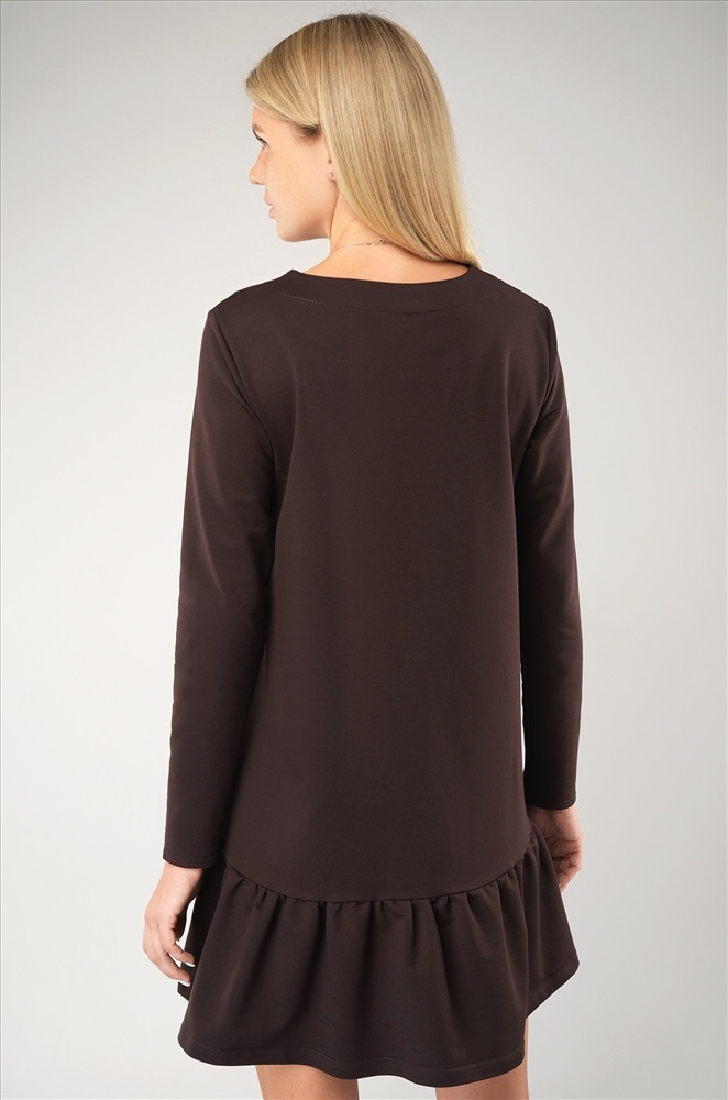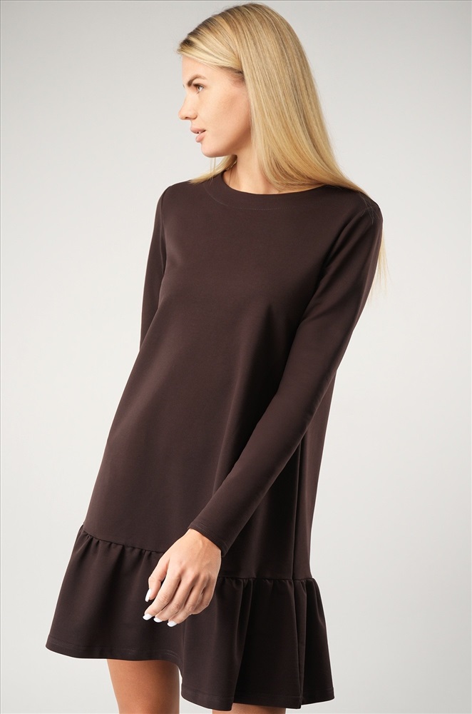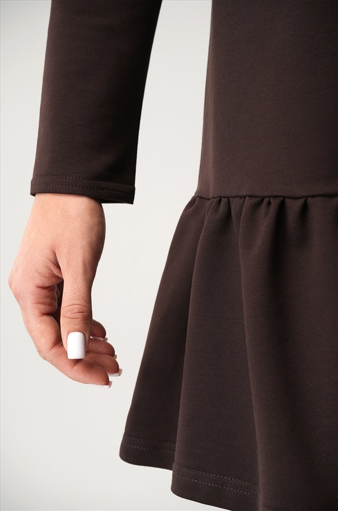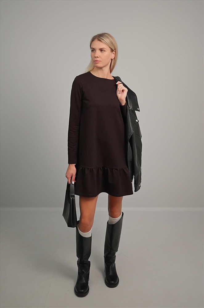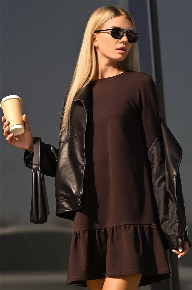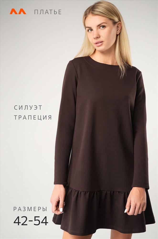 Преимущества: — плотный трикотаж футер двухнитка (240 г/м2) — дышащий и приятный к телу; — длинные рукава защищают от прохлады; — хлопковое платье имеет расклешённый крой и широкий волан по низу; — круглая горловина, красиво оформляющая линию шеи; — длина мини подчеркивает ноги и добавляет лёгкости; — свободный силуэт трапеция удобен для повседневных и офисных образов на весну и осень. Коричневое платье А-силуэта для женщин — стильное решение на каждый день.