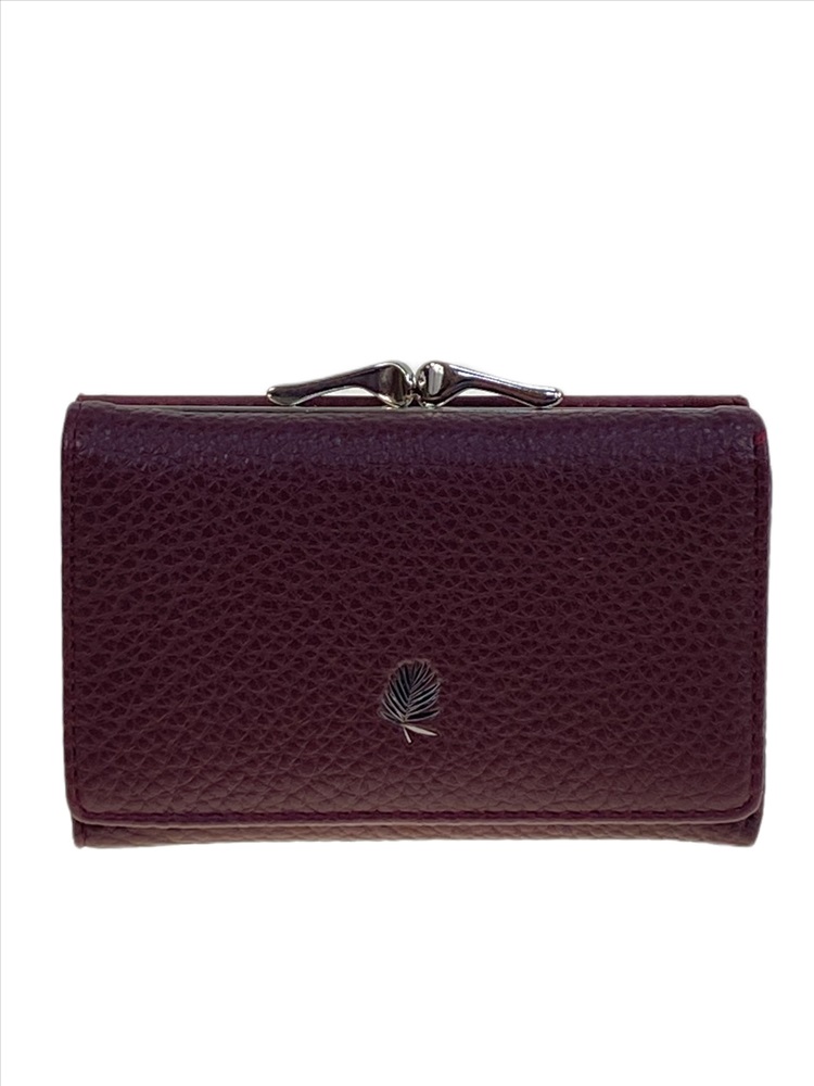 Компактный женский кошелёк из искусственной кожи. Кошелёк закрывается на кнопку. Внутри одно полноразмерное отделение под купюры, 6 отсеков для карт и три небольших открытых отделения. Снаружи отделение с фермуаром.