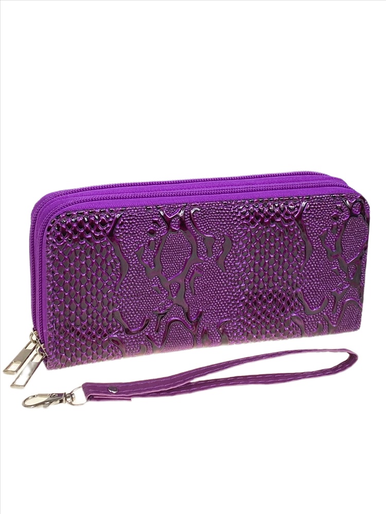 Полноразмерный женский кошелёк изискусственной кожи. Кошелёк имеет два отделения, каждое закрывается на круговую молнию. Внутри отделения под купюры, отделение на молнии, 12 отсеков для карт. В комплекте ремешок.