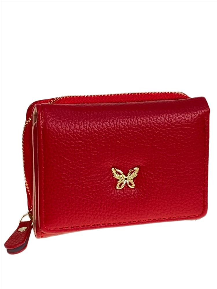Компактный женский кошелёк из искусственной кожи. Закрывается на магнитную кнопку, внутри отделение под купюры, 5 отсеков для карт. Снаружи, отделение на молнии.