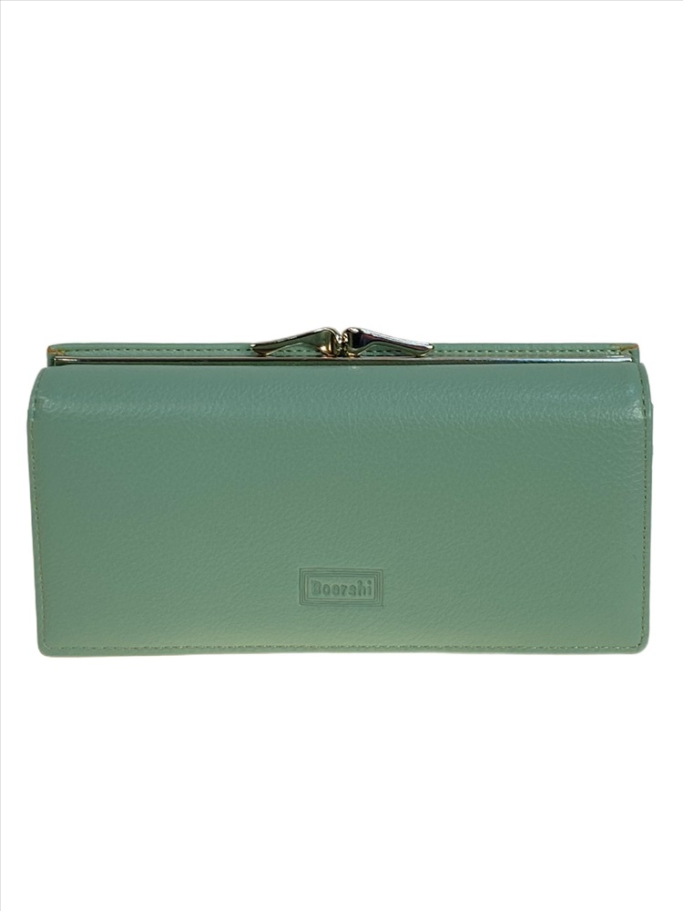Полноразмерный женский кошелёк из искусственной кожи. Кошелёк закрывается на скрытые магнитные кнопки. Внутри три отделения под купюры и отделение на молнии, на верхнем развороте открытое отделение и 4 отсека для карт, на нижнем развороте 4 отсека для карт. Снаружи отделение с фермуаром.