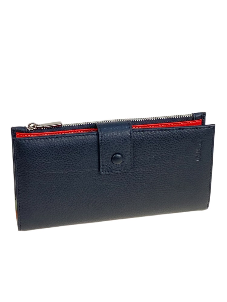 Полноразмерный женский кошелёк из натуральной кожи. Кошелёк закрывается на грот с магнитной кнопкой. Внутри пять отделений под купюры, 17 отсеков для карт и два отсека с пластиковым окном. Снаружи отделение на молнии.