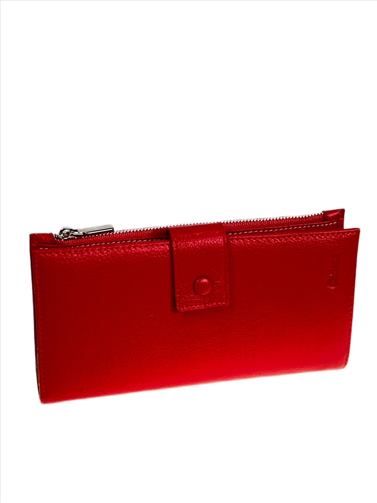 Полноразмерный женский кошелёк из натуральной кожи. Кошелёк закрывается на грот с магнитной кнопкой. Внутри пять отделений под купюры, 17 отсеков для карт и два отсека с пластиковым окном. Снаружи отделение на молнии.