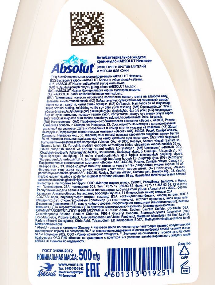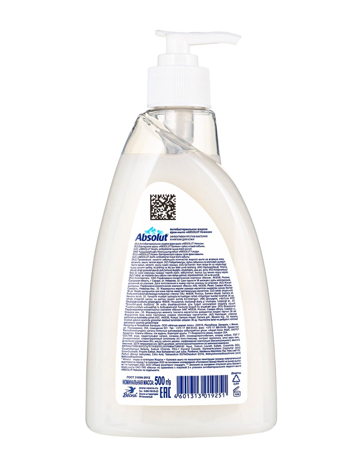 Габариты: 9,5 x 5,5 x 20 Страна: Россия В боксе: 12 шт Состав: См. на упаковке Материалы: см. на упаковке Фасовка: по 1 шт Индивидуальная упаковка: Без упаковки Сертификат: ЕАС Цвет: Белый Вес, г/Объём, мл: 500 Область применения: Для рук Аромат: Свежесть Тип: Жидкое Вид мыла: Антибактериальное Жидкое крем-мыло Absolut «Нежное» — это гармоничное сочетание эффективной антибактериальной защиты и мягкого ухода, подходящего даже для чувствительной кожи. Благодаря тщательно сбалансированной формуле с маслом чайного дерева и пантенолом, мыло не только бережно очищает кожу от загрязнений и бактерий, но и помогает сохранить её естественное увлажнение и эластичность. Масло чайного дерева известно своими природными антисептическими и противовоспалительными свойствами. Оно эффективно устраняет бактерии и предотвращает раздражения, придавая коже ощущение свежести и чистоты. Пантенол способствует восстановлению и смягчению кожи, предотвращает сухость и шелушение, а также поддерживает её естественный барьер. Кремовая текстура мыла образует густую, мягкую пену, которая деликатно очищает, не пересушивая кожу и оставляя после применения приятное ощущение ухоженности. Средство легко смывается, подходит для ежедневного использования всей семьёй. Способ применения: Нанесите небольшое количество мыла на влажные руки, вспеньте лёгкими движениями, равномерно распределите по коже и тщательно смойте водой. При необходимости используйте увлажняющий крем. Результат: Кожа чистая, мягкая и увлажнённая, без ощущения сухости и стянутости. При регулярном применении сохраняется ощущение комфорта и свежести, а кожа выглядит более ухоженной и здоровой. Absolut — ежедневная забота, чистота и защита, которой можно доверять. Комментарии к товару