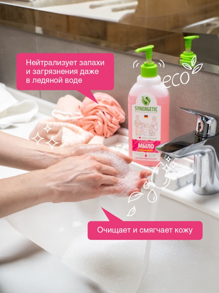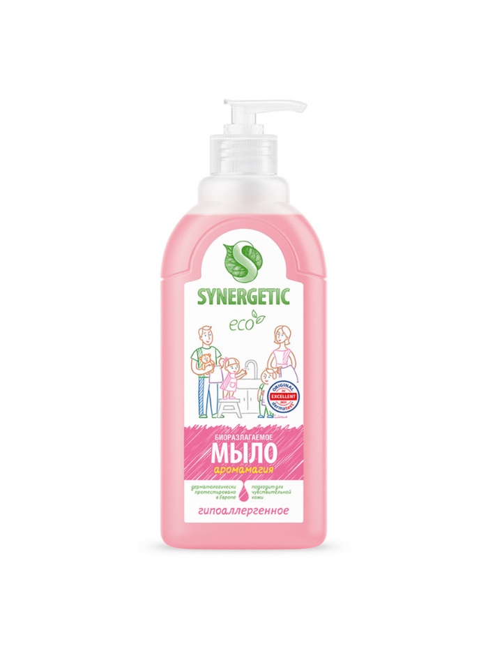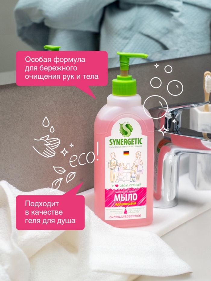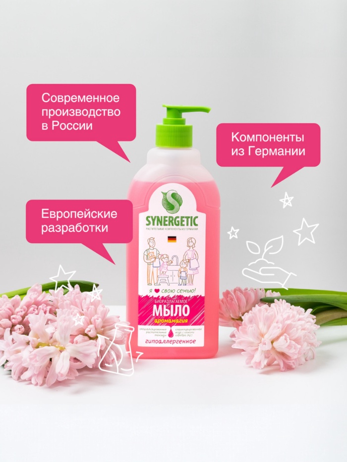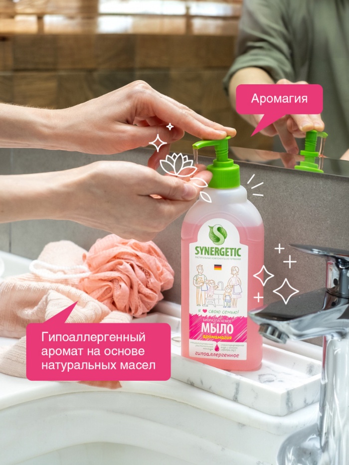 Биоразлагаемое увлажняющее мыло SYNERGETIC "Аромамагия" подходит для бережного очищения кожи рук и тела от любых загрязнений. Комбинация растительных А-тензидов, морской соли и натуральных эфирных масел герани, нероли, жасмина и розы эффективно устраняет загрязнения и неприятные запахи даже в холодной воде. Растительный глицерин обеспечивает интенсивное увлажнение кожи. Мультифункциональный компонент софоролипид мягко очищает и заботится о естественном микробиоме кожи. Гипоаллергенное средство подходит для чувствительной кожи. Мыло дерматологически протестировано независимым исследовательским институтом Dermatest®️ в Германии. Биоразлагаемые компоненты безопасны для природы и человека и не вредят микрофлоре септических установок. Жидкое мыло не содержит компонентов животного происхождения, не тестируется на животных и сертифицировано британской организацией The Vegan Society. Знак Vegan - мировой стандарт этичной продукции. Нанести небольшое количество на влажную кожу, вспенить, смыть водой. Только для наружного применения! Беречь от детей. При попадании средства в глаза промыть водой. Использовать строго по назначению. Aqua; Sodium Laureth Sulfate; Sodium Lauroamphoacetate; Peg-4 Rapeseedamide; Glycerin; Sea Salt; Undecylenamidopropyltrimonium Methosulfate; 2 Phenoxyethanol; Nonallergenic Parfume with Natural Oils; Candida Bombicola / Glucose / Methyl Rapeseedate Ferment; Citric Acid; Melaleuca Alternifolia (Tea Tree) Leaf Oil; Eucalyptus Globulus Leaf Oil; Thymus Vulgaris (Thyme) Flower / Leaf Oil; Glycol Distearate; Cocos Nucifera (Coconut) Fruit Extract; Vitamin Complex (A, E, F): Ethyl Linoleate, Isopropyl Myristate, Cetearyl Ethylhexanoate, Triticum Vulgare Germ Oil, Retinyl Palmitate, Retinyl Acetate, Tocopheryl Acetate.