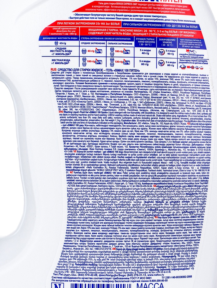 Габариты: 7 x 14 x 28 Доставка: Платная Страна: Россия В боксе: 4 шт Состав: См. на упаковке Материалы: см. на упаковке Фасовка: по 1 шт Индивидуальная упаковка: Без упаковки Сертификат: Не подлежит сертификации Объём, л: 1,3 Назначение: Для всех видов тканей Вид стирки: Для всех видов стирки Темпер. ограничение НЕ НИЖЕ ℃: 0 Особенности средства: Концентрат Жидкое средство для стирки BiMax "100 пятен", гель, универсальное, 1.3 л -Новая активная концентрированная формула эффективно справляется со сложными пятнами, придает неповторимый аромат свежести Вашему белью -Гель-концентрат, заменяет 3 кг стандартного неконцентрированного порошка -Удаление пятен – умные энзимы распознают и удаляют загрязнения из волокон ткани Способ применения: При среднем загрязнение берем 65 г порошка, при сильном загрязнение 100 г порошка.( средняя жесткость воды). Ручная стирка берем 5 л воды и 40 гр порошка. При среднем загрязнение берем 100г порошка и сильном загрязнение 130 г порошка. ( жесткая вода). Ручная стирка берем 5 л воды и 60 гр порошка. Состав:5 % или более, но менее 15%: анионные ПАВ; менее 5%: неионогенные ПАВ, мыло (соли жирных кислот), фосфонаты, энзимы, ароматизирующая добавка (в т.ч. гераниол, линалоол, гексилциннамаль, лимонен), оптический отбеливатель, консервант, краситель. Меры предосторожности Использовать средство только по назначению. Хранить в недоступном для детей месте. Хранить вдали от пищевых продуктов. Хранить с закрытой крышкой. Хранить в сухом, прохладном и темном месте. Условия хранения: Хранить вдали от пищевых продуктов; беречь от детей, предохранять от прямых солнечных лучей. При попадании в глаза немедленно промыть проточной водой. При повышенной чувствительности и повреждениях кожи избегать длительного контакта со средством. Средство замерзает. После размораживания сохраняет свои свойства. Комментарии к товару