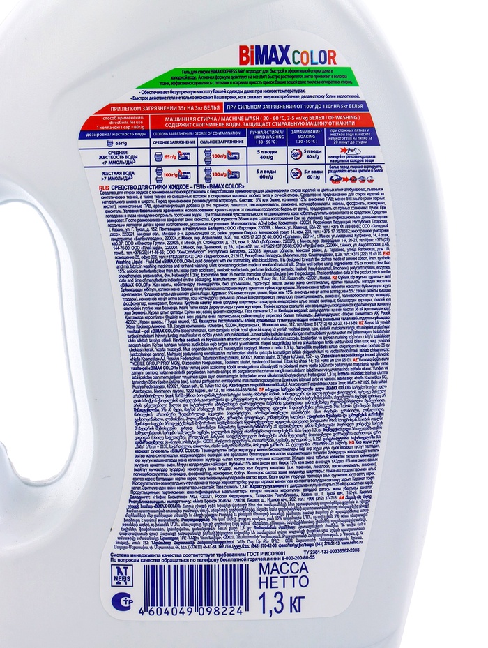 Жидкое средство для стирки BiMax Color Iq smart, гель, для разноцветных тканей, 1.3 л