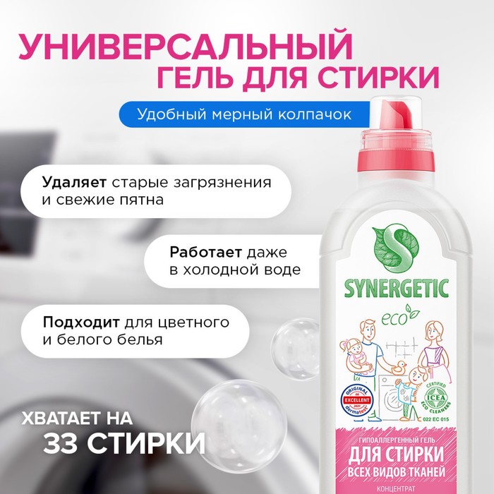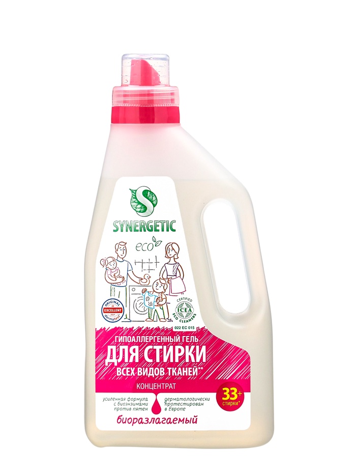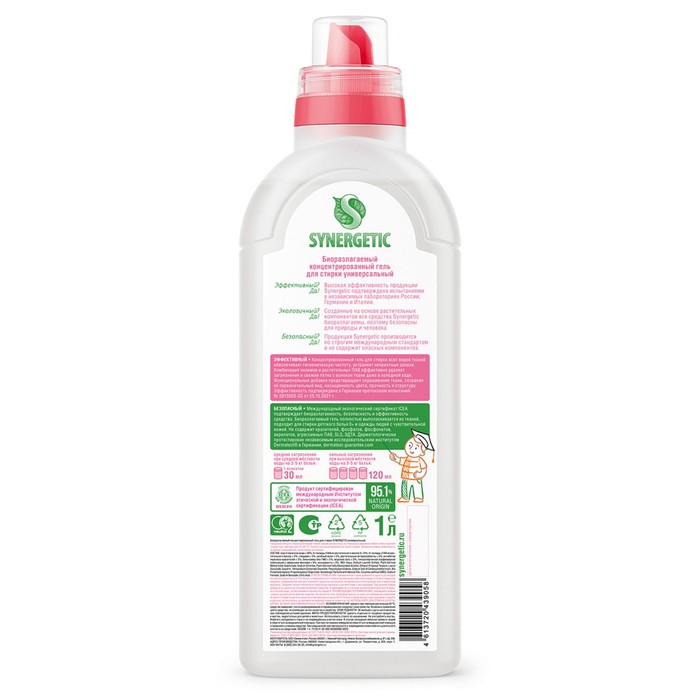 Габариты: 9 x 6,5 x 26,5 Доставка: Платная Страна: Россия В боксе: 8 шт Состав: См. на упаковке Материалы: см. на упаковке Фасовка: по 1 шт Индивидуальная упаковка: Без упаковки Сертификат: ЕАС Объём, л: 1 Назначение: Для всех видов тканей Вид стирки: Для всех видов стирки Темпер. ограничение НЕ НИЖЕ ℃: 0 Особенности средства: Гипоаллергенность, Экосредство Биоразлагаемый концентрированный гель для стирки SYNERGETIC универсальный обеспечивает бережное и эффективное очищение тканей, гигиеническую чистоту одежды и устраняет неприятные запахи. Комбинация энзимов и растительных ПАВ эффективно удаляет загрязнения и свежие пятна с волокон ткани даже в холодной воде. Функциональные добавки предотвращают окрашивание, а также повторное оседание загрязнений на ткани, сохраняя ее первоначальный вид, насыщенность цвета, прочность и структуру. Гипоаллергенная отдушка на основе эфирных масел оставляет легкий и приятный аромат. Гель предназначен для стирки всех видов тканей, кроме деликатных и мембранных, а также шерсти и шелка. Средство можно использовать в стиральных машинах любого типа и при ручной стирке при температуре 15 - 90 °C. Биоразлагаемый гель полностью выполаскивается из тканей, подходит для стирки детского белья 0+ и одежды людей с чувствительной кожей. При машинной стирке добавьте от одного до четырех колпачков средства на 3 - 5 кг белья, в зависимости от степени загрязнения и жесткости воды, в отсек стиральной машины, предназначенный для для моющего средства (если иное не прописано в инструкции для стиральной машины). Закройте отсек и включите стиральную машину в соответствии с инструкцией. При ручной стирке добавьте от одного до четырех колпачков средства, в зависимости от степени загрязнения и жесткости воды, на 5 литров воды, затем положите белье и постирайте. Соблюдайте режим стирки, указанный на ярлыке изделия. Не наносите гель непосредственно на ткань во избежание изменения ее цвета. Стирайте цветные вещи при температуре не выше 40 °C. Новые, а также белые и цветные вещи стирайте отдельно, если степень устойчивости окраски ткани не известна. Не используйте для стирки шерсти, шелка, деликатных и мембранных тканей. Хранить отдельно от пищевых продуктов, в местах, недоступных для детей и животных. Использовать строго по назначению. Не употреблять внутрь. Избегать попадания в глаза и на повреждённые участки кожи. В случае попадания обильно промыть водой и обратиться за медицинской помощью. При проглатывании немедленно обратиться за медицинской помощью и предъявить упаковку средства. При повышенной чувствительности и повреждениях кожи избегать длительного контакта со средством. Состав:Подготовленная вода > 30%; А-тензиды (ПАВ из растительного масла) 5–15%; Н-тензиды (ПАВ из растительного масла) < 5%; глицерин < 5%; зелёный хелат (ГЛДА) < 5%; растительные антиресорбенты < 5%; ингибитор переноса красителей < 5%; био-энзимы без ГМО < 5%; морская соль < 5%; гипоаллергенная парфюмерная композиция с эфирными маслами лаванды и литсеи < 5%; консерванты < 5%. Комментарии к товару