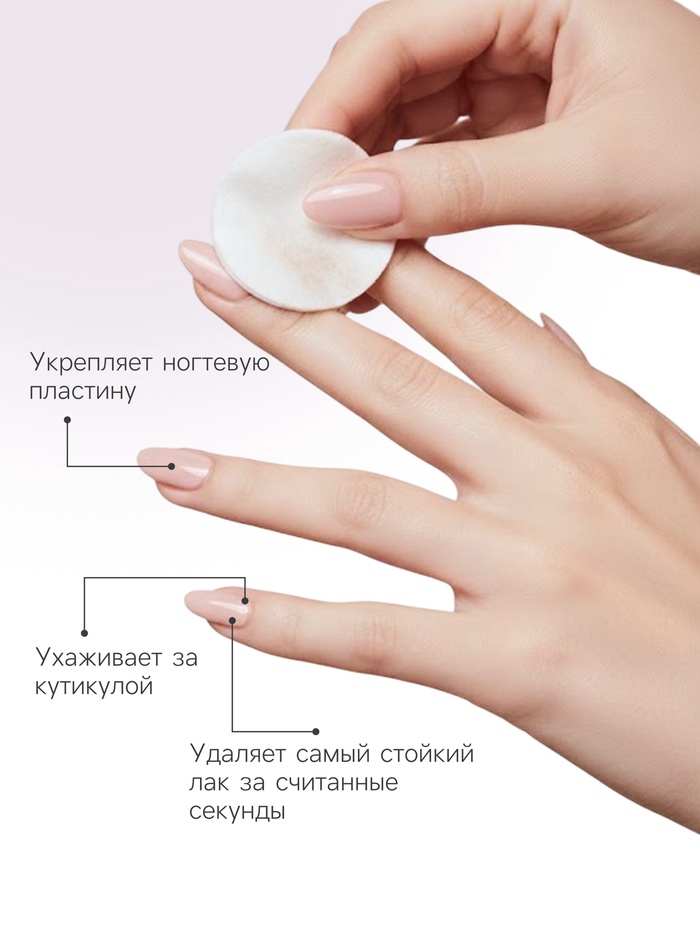 Способ применения: ватный диск, смоченный жидкостью, приложить к ногтю и аккуратно удалить покрытие.