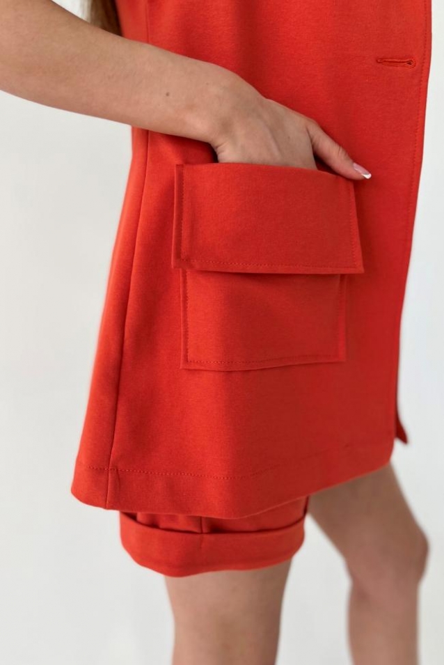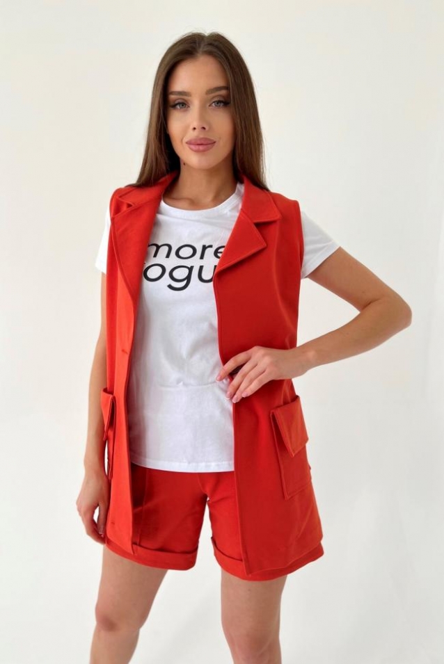 Жилет полуприлегающего силуэта, длиной до середины бедра, с английским воротником. В нижней части полочки расположены накладные карманы с клапаном.