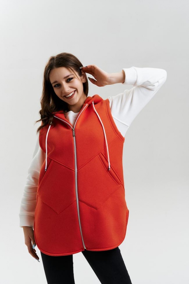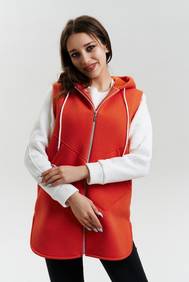 Жилет утепленный, прямой, на молнии, с капюшоном, с фигурной линией низа. Полочка с фигурными кокетками и удобными накладными карманами.