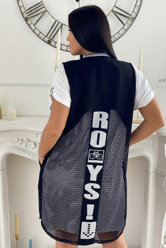 Подходит к платью 9064; продается отдельно Жилет женский прямого силуэта. Застежка на тесьму-молнию. Нижняя часть полочки и спинки из крупной сетки, на полочке два накладных кармана с клапанами. На верхней части полочки, клапанах и центральной части спинки принт в виде букв.