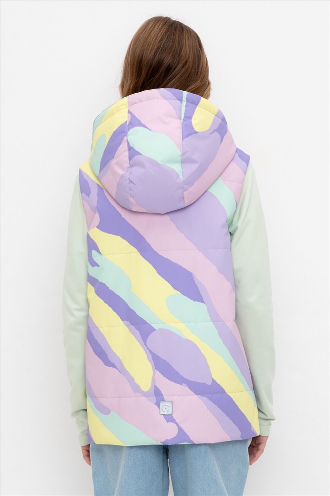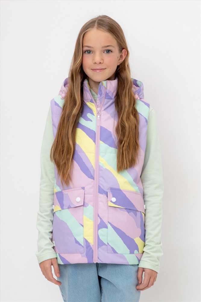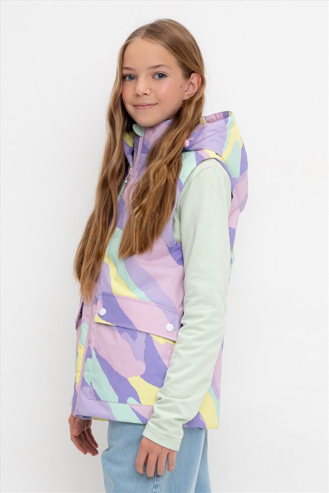 Стеганый жилет с капюшоном для девочки с утеплителем Fellex®: 120 г/м2. Выполнен из мембранной ткани с дополнительной тефлоновой обработкой. Данный вид обработки предохраняет изделие от загрязнения и лучше отводит влагу. Подклад из 100% полиэстра. У изделия предусмотрена защита подбородка. Капюшон утягивается при помощи эластичного шнура со стопперами. Накладные карманы с клапанами на кнопках. Во всех изделиях верхнего ассортимента для безопасности ребенка предусмотрены светоотражающие элементы.